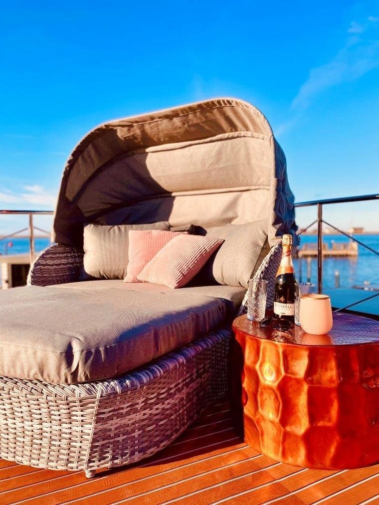 Das 30 m2 große Roof-Deck bietet Euch einen herrlichen Rundumblick auf das maritime Flair der Marina, das vorgelagerte Naturschutzgebiet Steinwarder und natürlich auf das Meer - von Sonnenauf- bis Sonnenuntergang. Die großzügigen Sonnenlounges auf Deck bieten vielfältige Möglichkeiten zum Entspannen und Sonnenbaden.