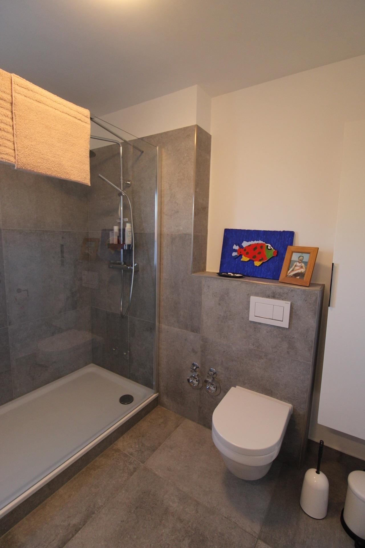 Da sich das Haus in einer Hanglage befindet, liegt der nördliche Eingang der Wohnung im 1. Obergeschoss, während sich die Wohnung nach Süden in den parterre gelegenen Garten öffnet. Vor dem Haus besteht eine Parkmöglichkeit