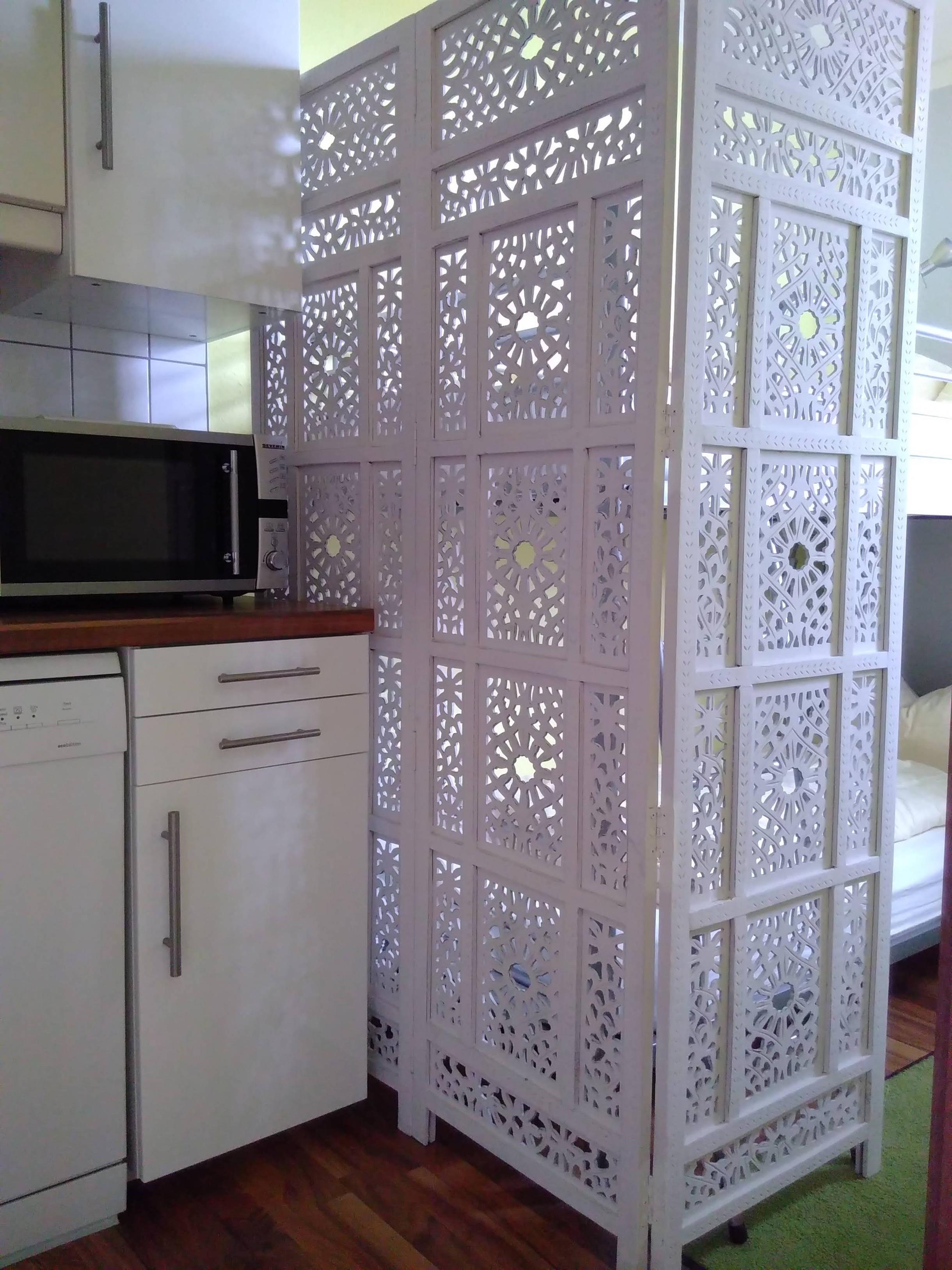 Das Kinderzimmer hat ein Etagenbett (2m x 0,90 ), wird aber nur durch einen kleinen Raumteiler optisch von der Küche getrennt.