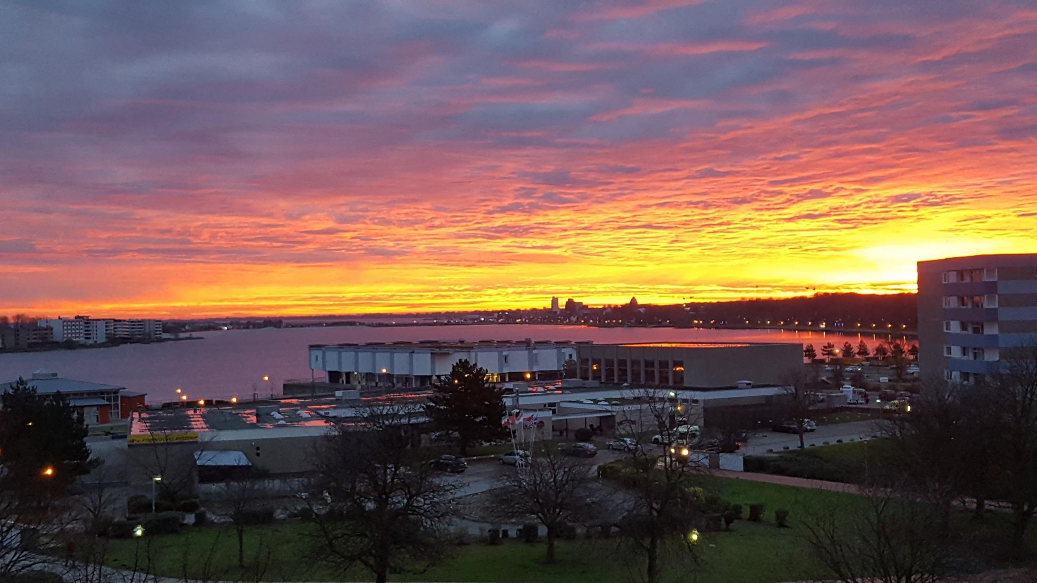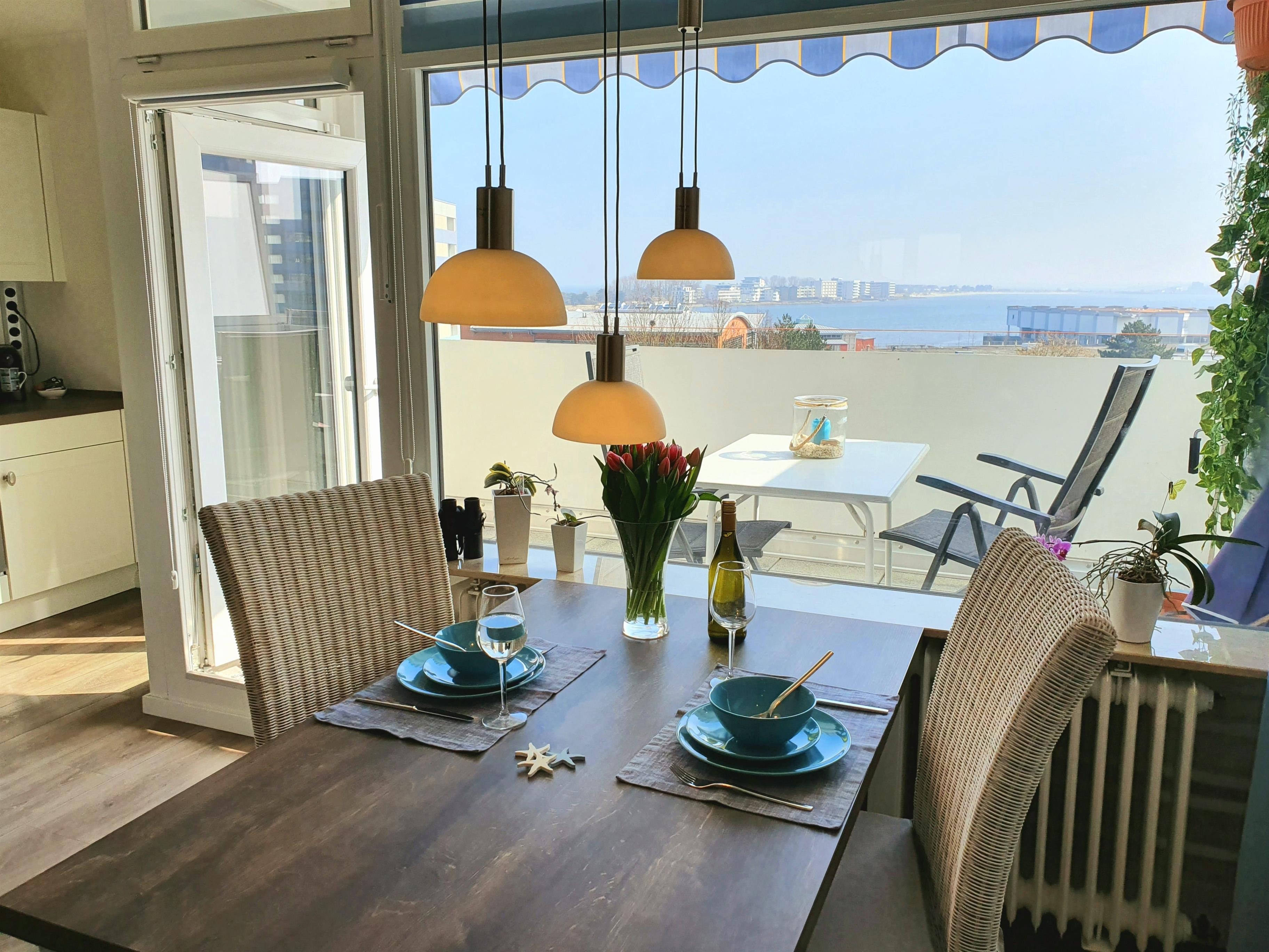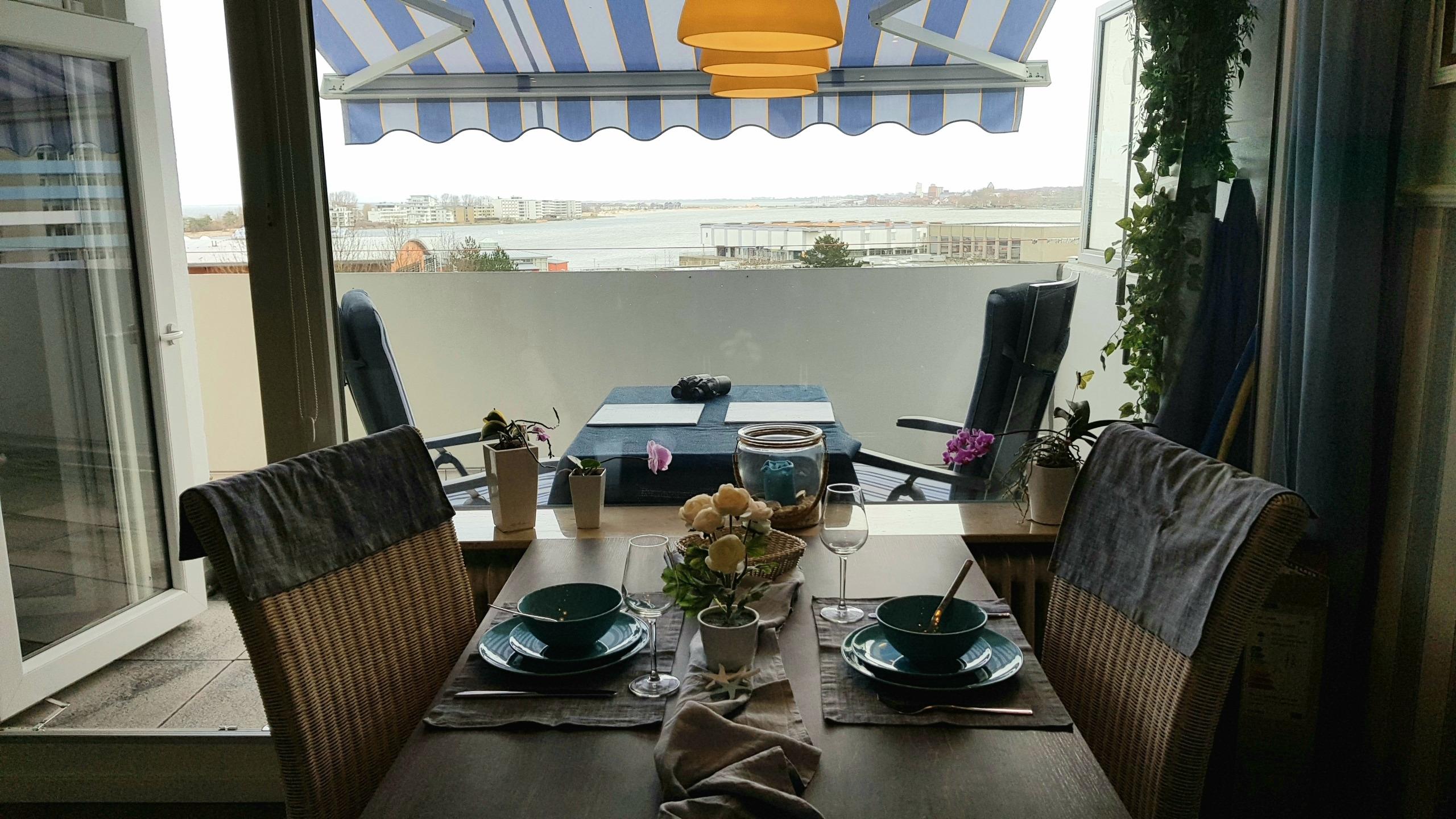 Die Ferienwohnung befindet sich im 5.Stock mit Blick auf den Binnensee. Genießt den Sonnenaufgang bei einem leckeren Frühstück auf eurem XL Balkon.