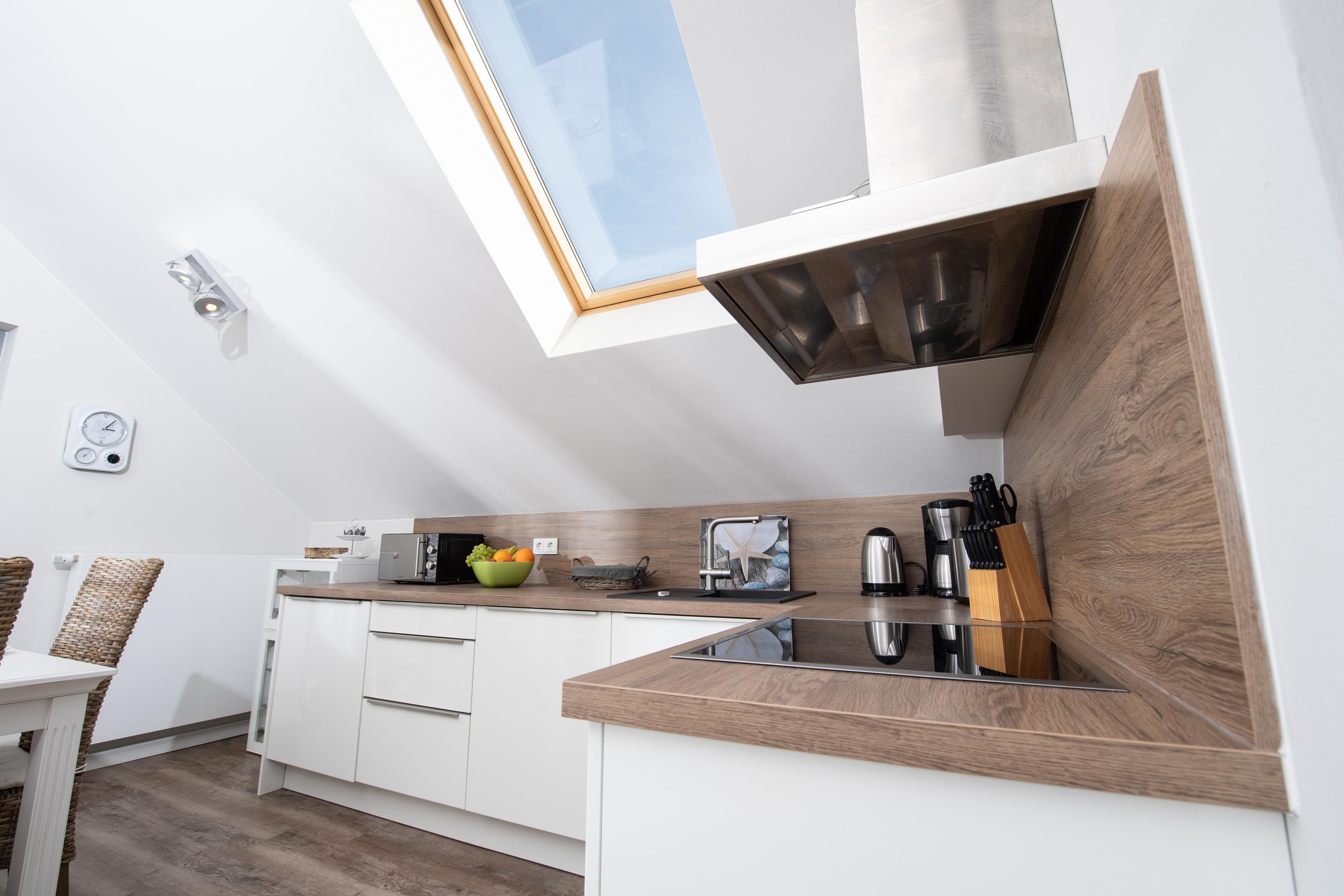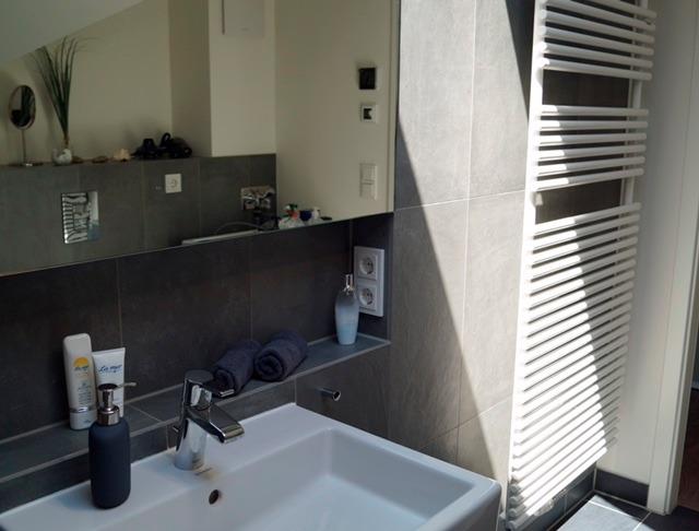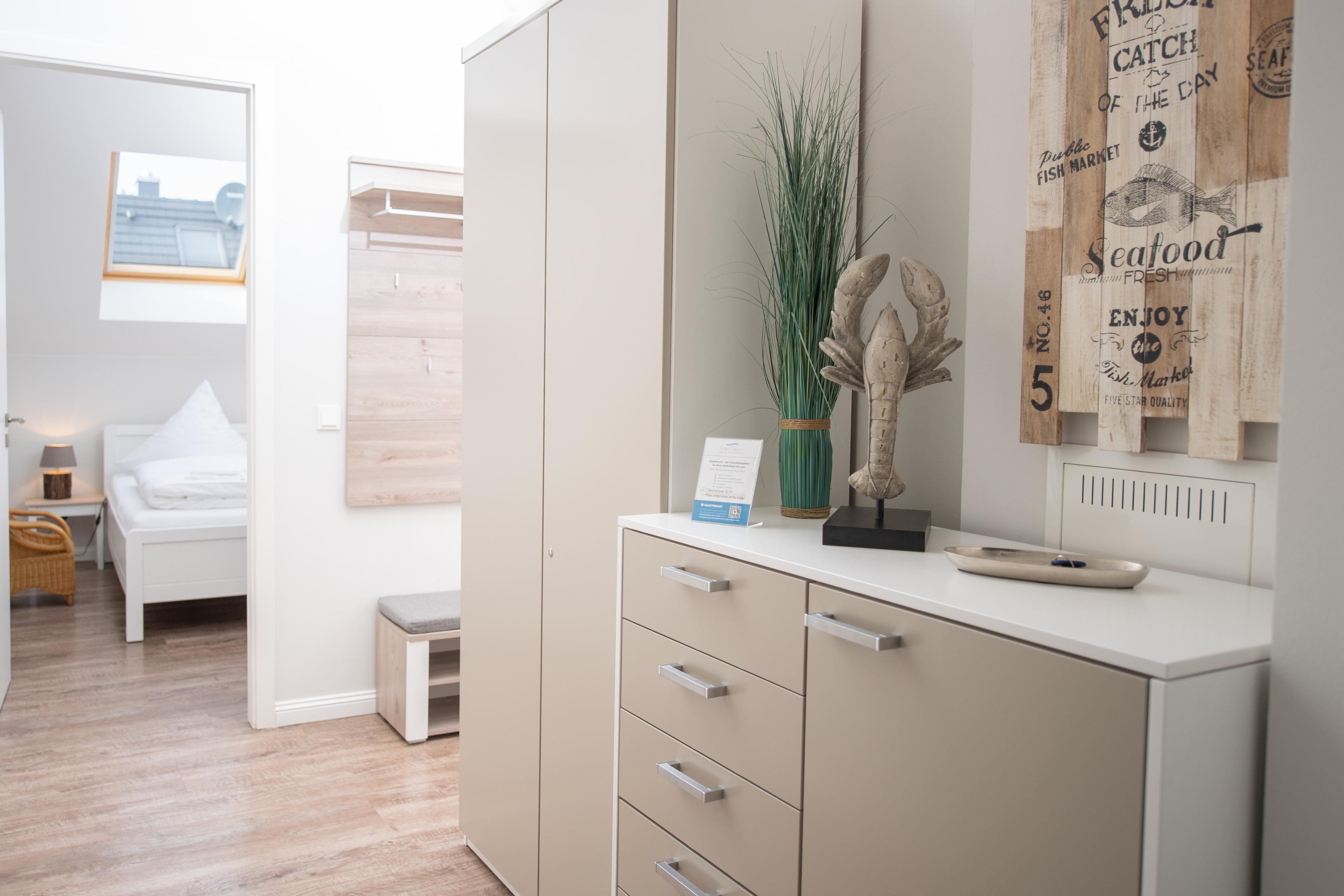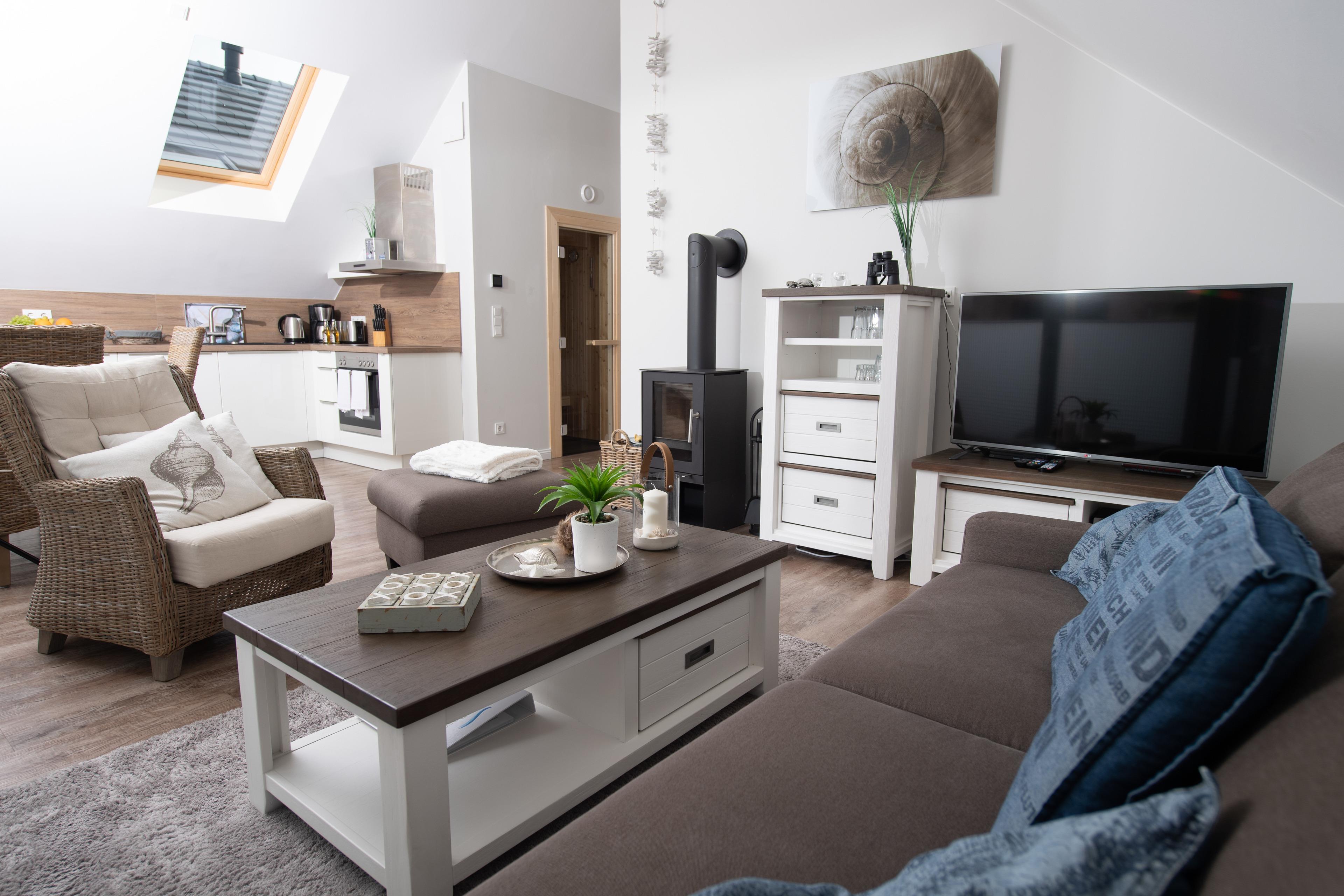 Die Ferienwohnung bietet eine hochwertige Ausstattungslinie mit Küche, Sauna und Kamin. Zwei Schlafzimmer, eins davon mit Boxspringbett, das zweite mit zwei Einzelbetten. Ideal für eine Familie mit zwei Kindern als auch für vier Erwachsene. Genießen Sie in beiden Schlafzimmern die Verdunklungsmöglichkeiten der Fenster.