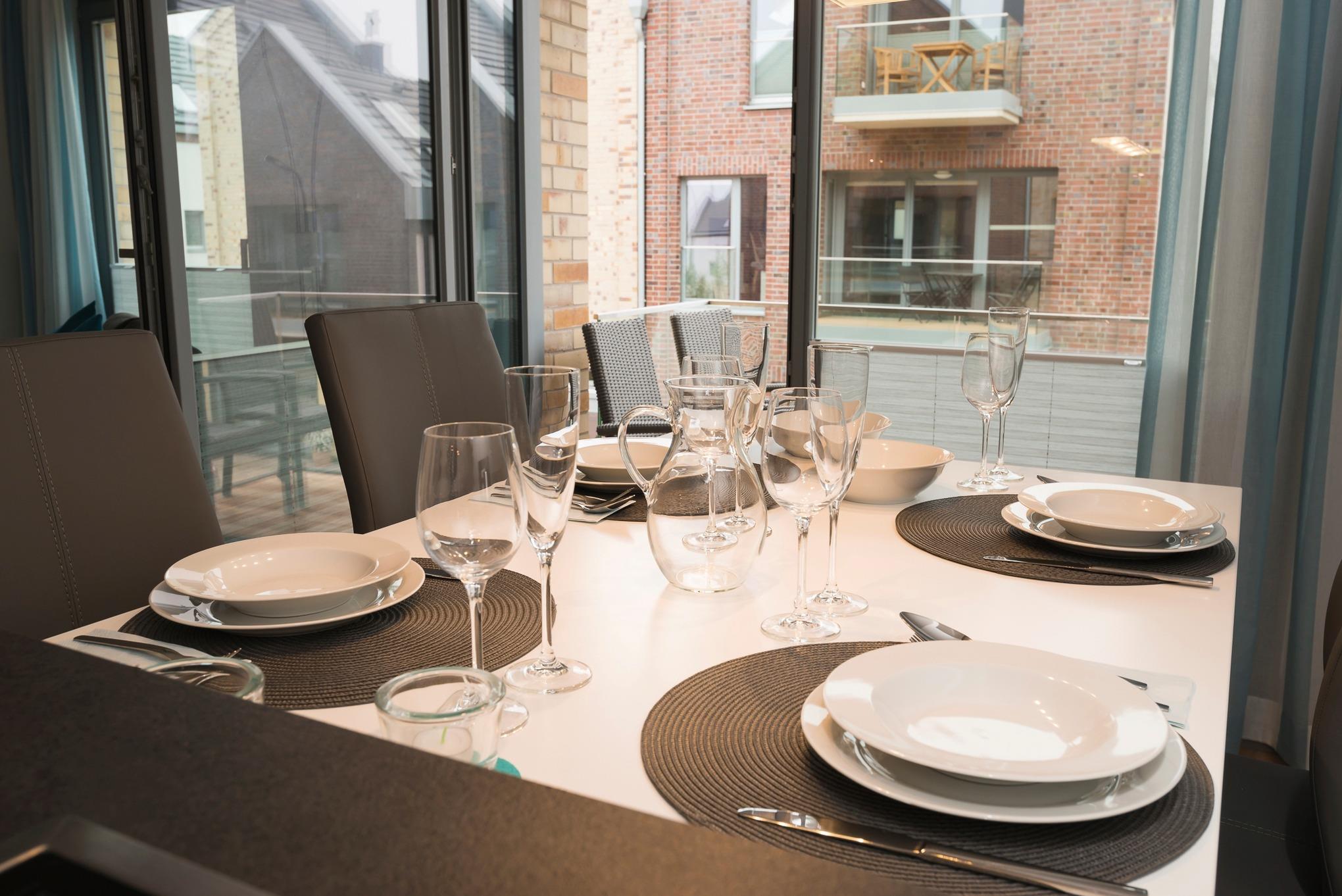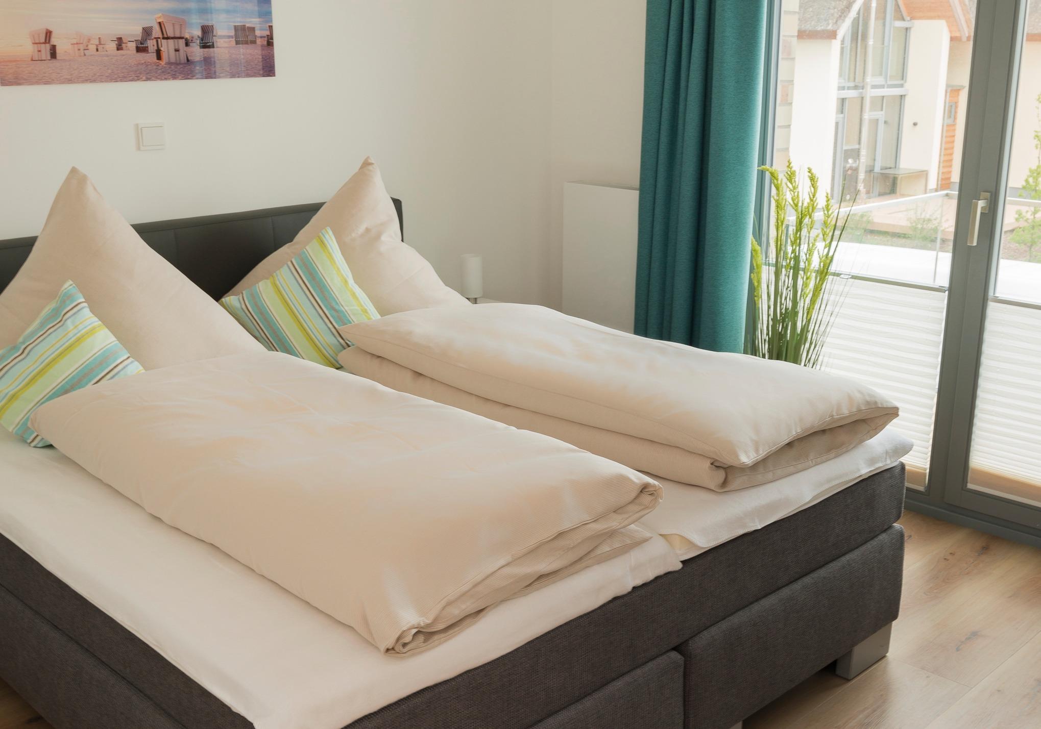 Die modern eingerichtete Ferienwohnung bietet Ihnen ein Schlafzimmer mit einem Doppelbett (Boxspringbett), ein kleines Schlafzimmer mit einem Etagenbett und ein großzügiges Wohn-und Esszimmer mit einer voll ausgestatteten Küche inklusive Geschirrspülmaschine und Mikrowelle.