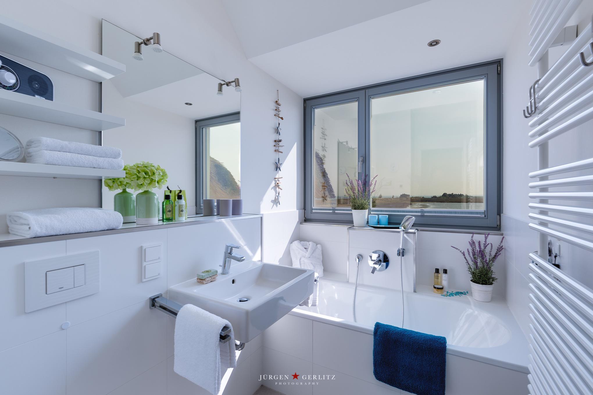 Im Obergeschoss befinden sich drei Schlafräume sowie ein komfortables Badezimmer (WC/Badewanne/große Dusche/Waschmaschine), von dem aus man einen malerischen Ausblick auf Graswarder und Fehmarnsundbrücke hat. Zwei nach Süden ausgerichtete Schlafzimmer eröffnen mit ihren raumhohen Panoramafenstern Perspektiven in den Yachthafen. Sie sind jeweils mit großen Boxspring-Doppelbetten (180x200 cm) ausgestattet. Weiteres Highlight ist das zur Ostsee gelegene, mit zwei Boxspring-Einzelbetten (140x200 cm und 90x200 cm) versehene Schlafzimmer. Der großzügige Raum lädt mit bequemen Sesseln an der großen, bodentiefen Fensterfront auch sonst zum Verweilen ein und bietet mit seinem Balkon dazu noch ein exklusives Außenerlebnis: über Strand und Ostsee gelegen kann man hier den Blick von der Seebrücke über Fehmarn zum Graswarder schweifen lassen und dazu in den Sommermonaten noch atemberaubende Sonnenuntergänge ins Meer erleben! Und: Wer länger wach bleibt oder ganz früh ist, kann die Sonne dort sogar wieder aufgehen sehen...