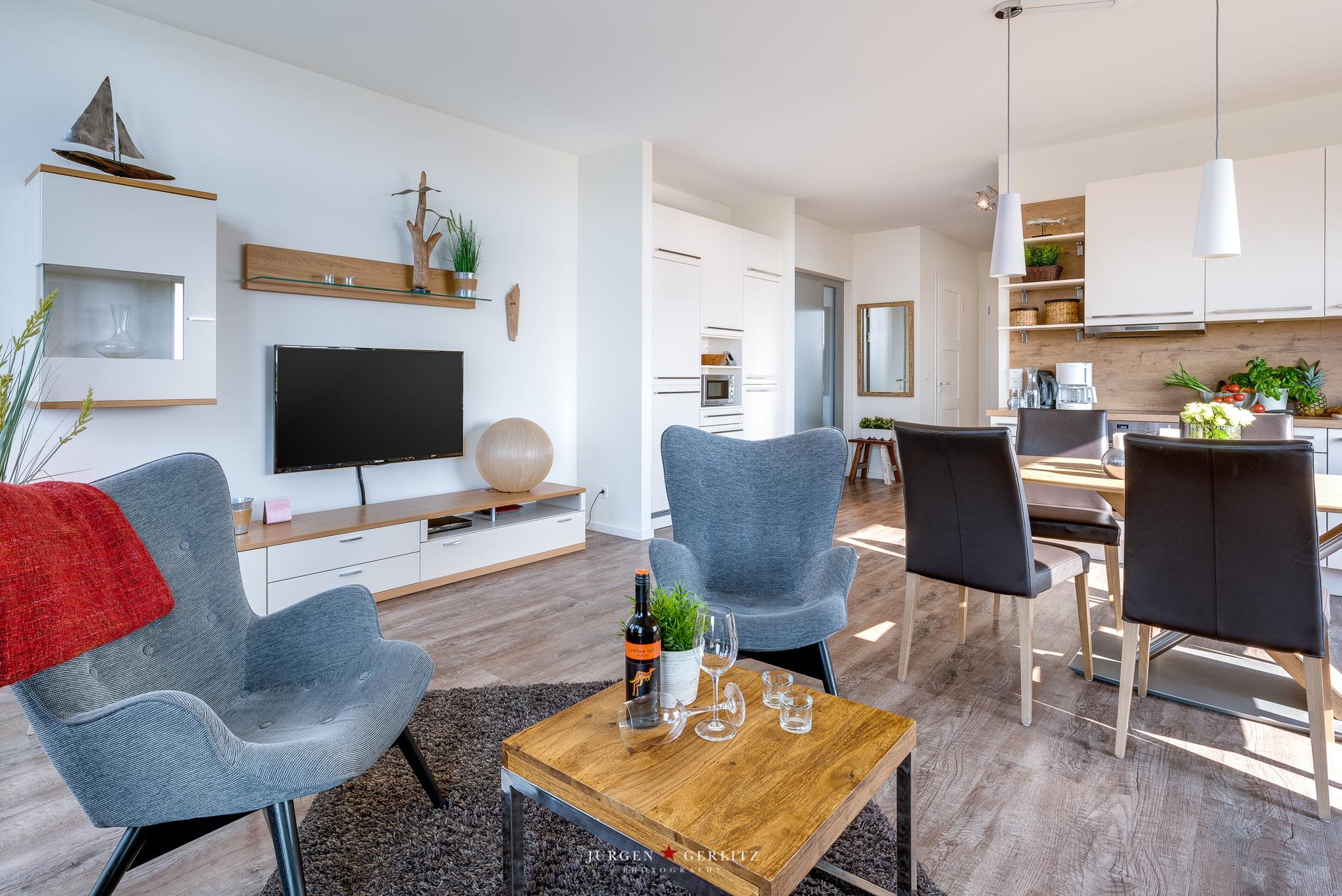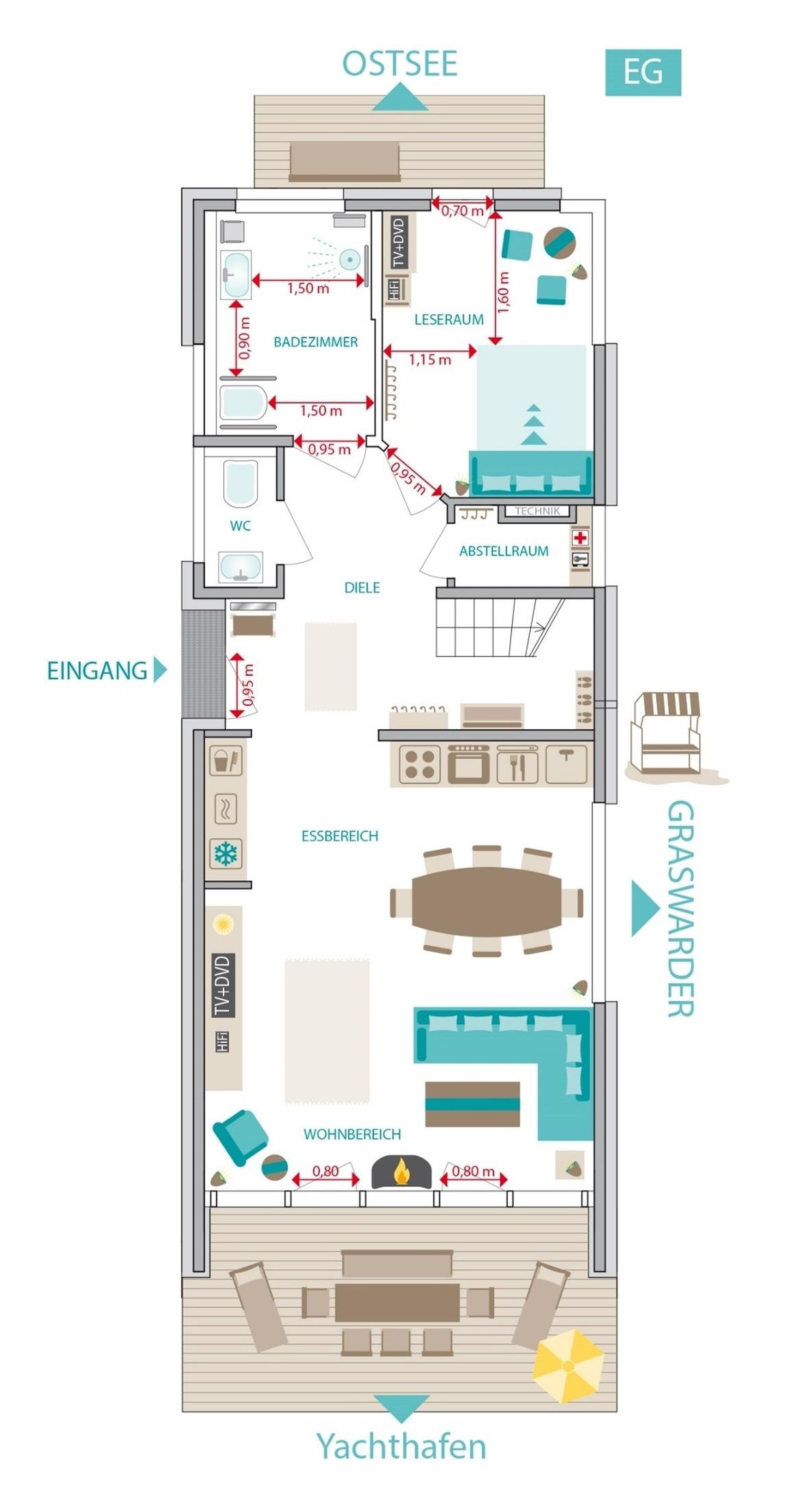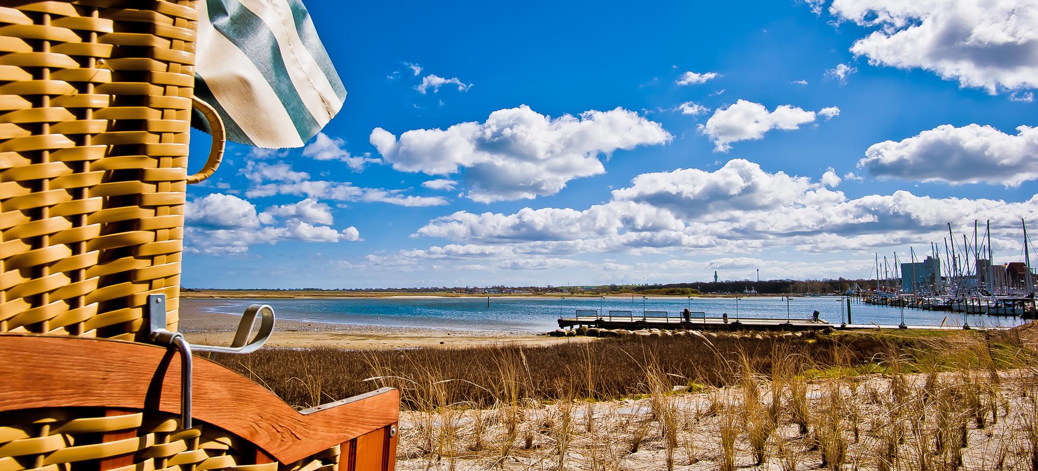 Im Eingangsbereich erwartet den Gast eine geräumige Diele mit praktischen Sitz- und Ablagemöglichkeiten. Rechts gelangt man in den großen, lichtdurchfluteten Wohn- und Essraum mit komfortabler, komplett ausgestatteter Küchenzeile. Am großzügigen Esstisch wird alles zu einem besonderen Genuss: direkt am breiten Panoramafenster gelegen hat man einen einzigartigen Blick auf das Ostseewasser und Graswarder. Von der gemütlichen Sofaecke mit Kaminofen und Sessel kann man durch die raumhohe Fensterfront das maritime Treiben im Yachthafen beobachten oder in anderer Form Entspannung finden (z.B. TV/Blue-Ray-Player/HiFi-Anlage). Auf der großen Süd-Terrasse mit bequemen Sitzmöbeln und Grillmöglichkeit lässt es sich ebenfalls stundenlang aushalten, um Ausblick, Sonne und Wasser zu genießen oder sich einfach nur die Meeresbrise um die Nase wehen zu lassen. Und nicht nur das: Eine traumhafte Rückzugsmöglichkeit und einen echten Hingucker bietet der schicke Strandkorb an der Ostseite des Hauses, mitten im Dünensand gelegen. Hier ist man ganz für sich, davor nur Himmel, Wasser und Natur... das ist Urlaubsfeeling pur!