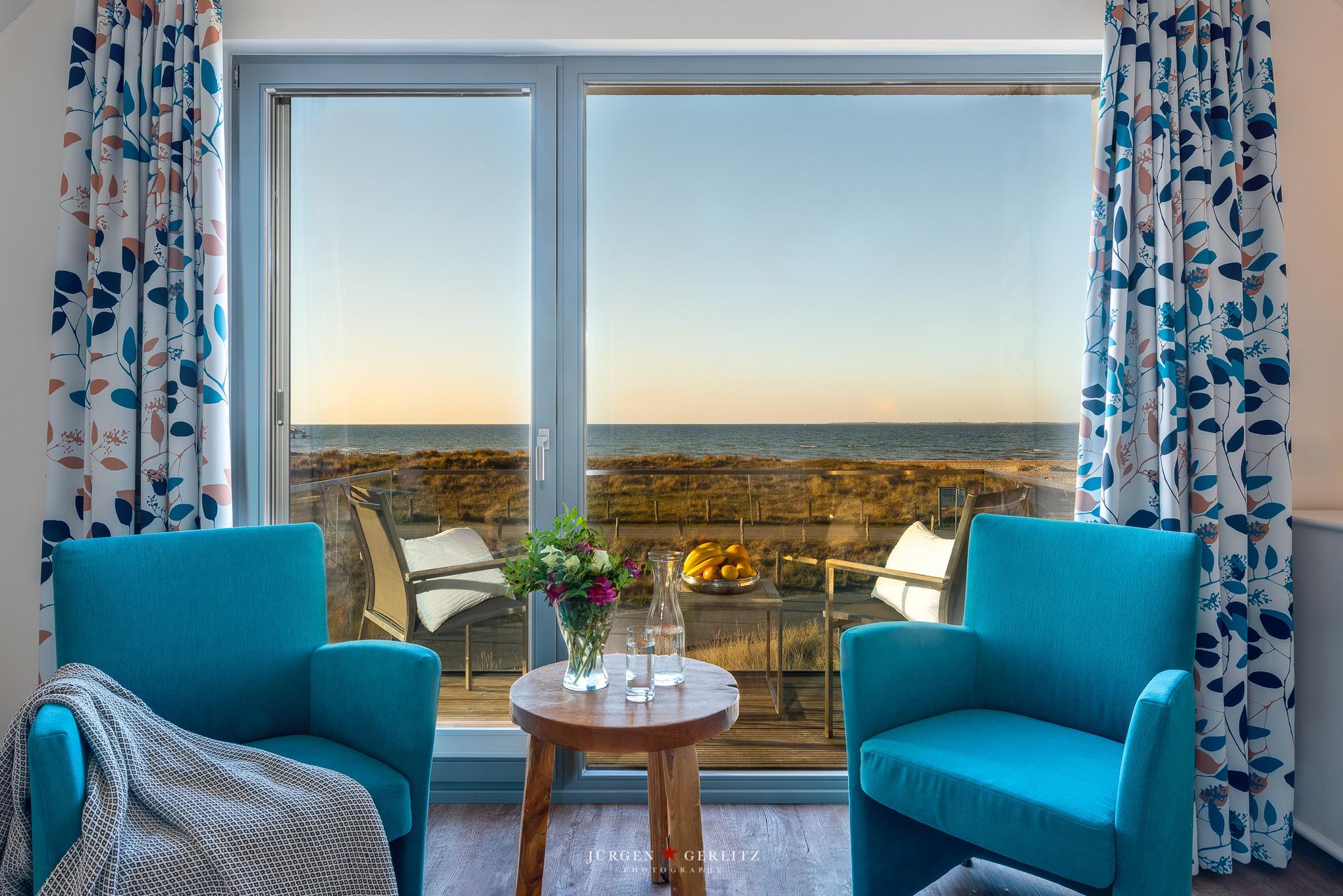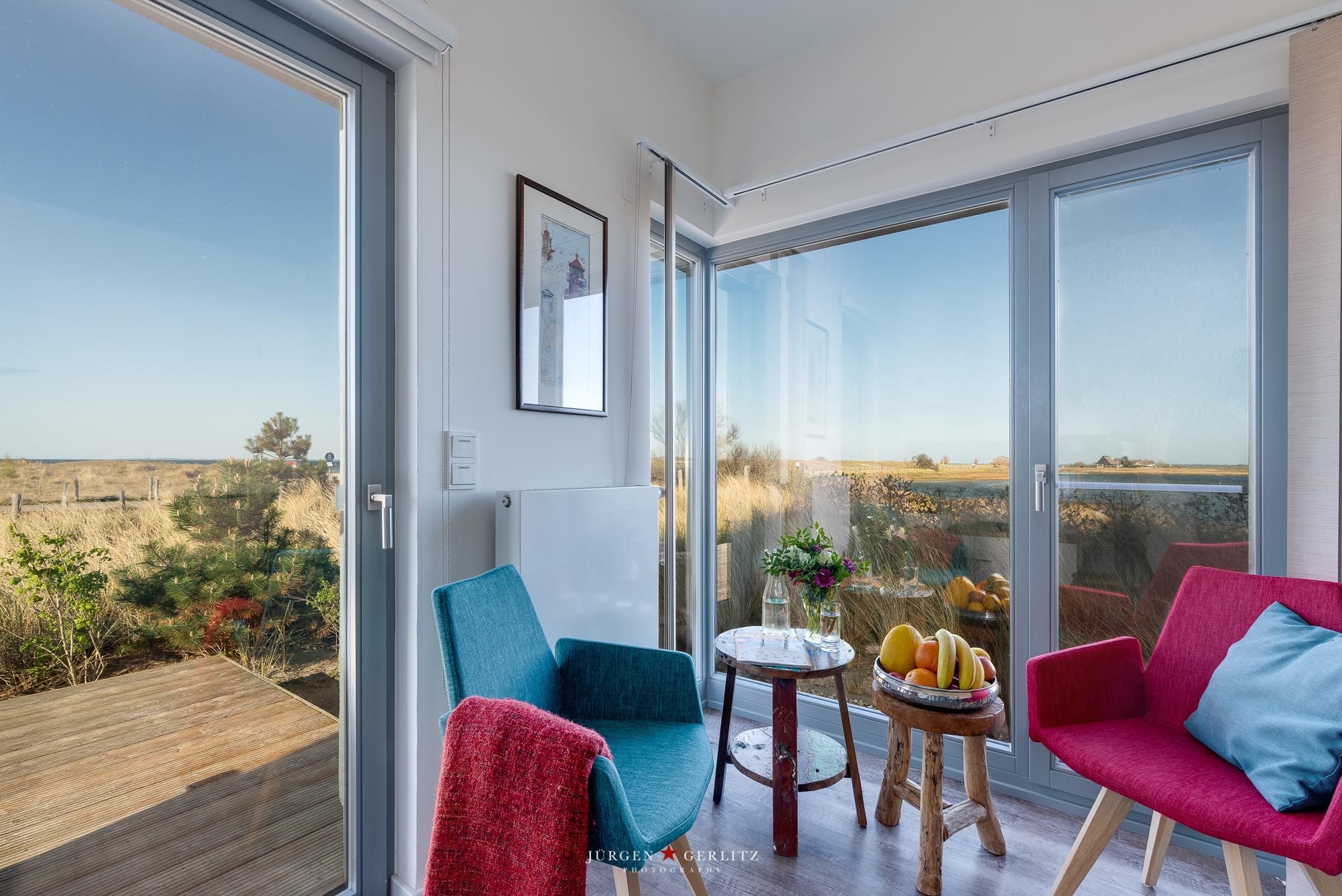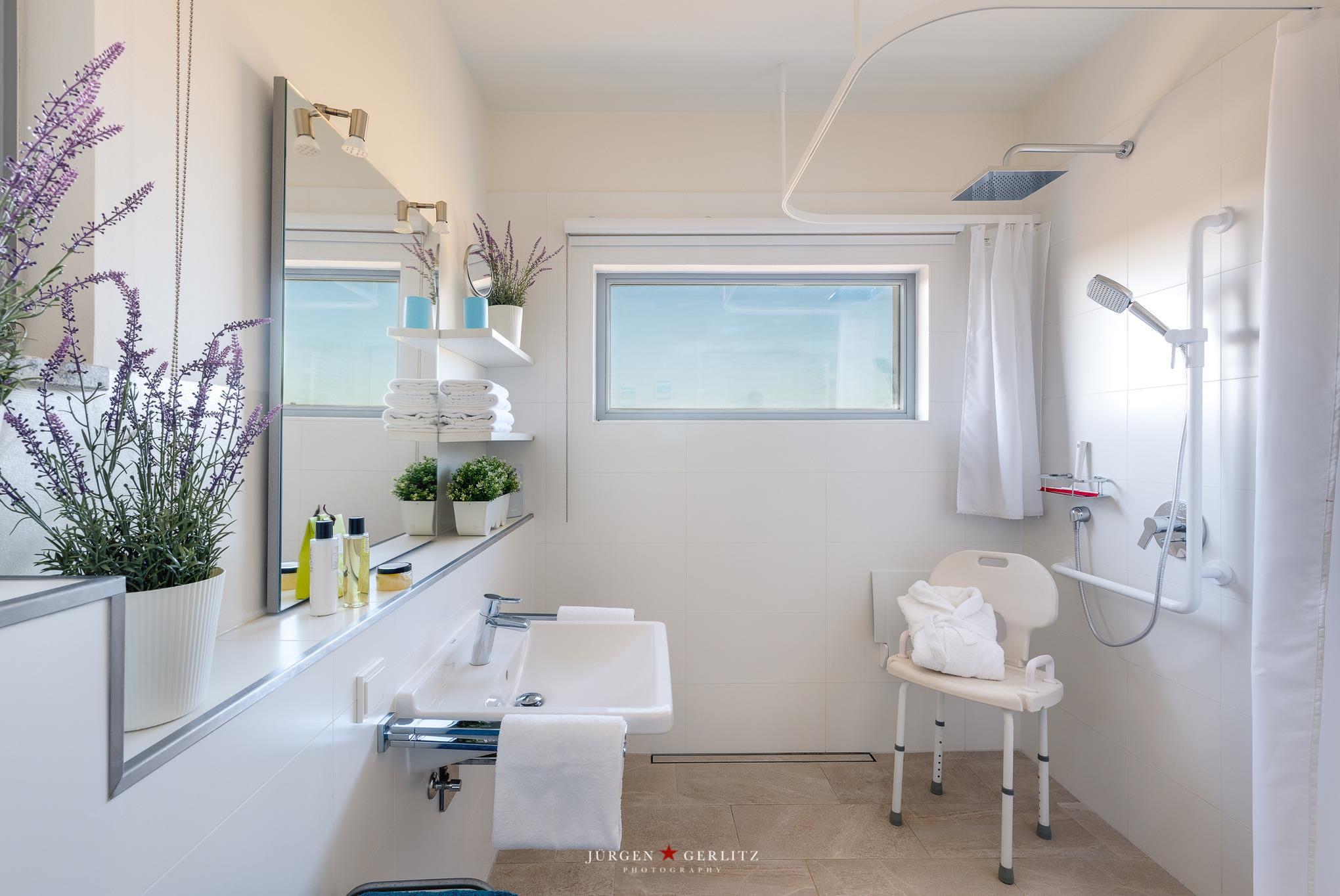 Zurück in der Diele findet sich linker Hand ein Gäste-WC sowie ein geräumiges, rollstuhlgerechtes Bad (WC mit Klappgriffen, befahrbare Dusche mit Haltestange, Duschsitz und Duschstuhl/unterfahrbares Waschbecken etc.). Der Lese- und Ruheraum ist mit kleiner Sitzecke einschließlich TV, Blue-Ray-Player und HiFi-Anlage ausgestattet und lädt zum Verweilen mit Blick auf die Dünen, Strand, Ostsee und Graswarder ein. Das komfortable Sofa kann dabei mit einem Griff in eine bequeme Liege- und Ruhemöglichkeit (Matratze 140x200 cm) umgewandelt werden. Diesem Raum schließt sich ebenfalls eine Terrasse an – hier bietet die rustikale Teakbank einen weiteren Bestplatz mit Ausblick!