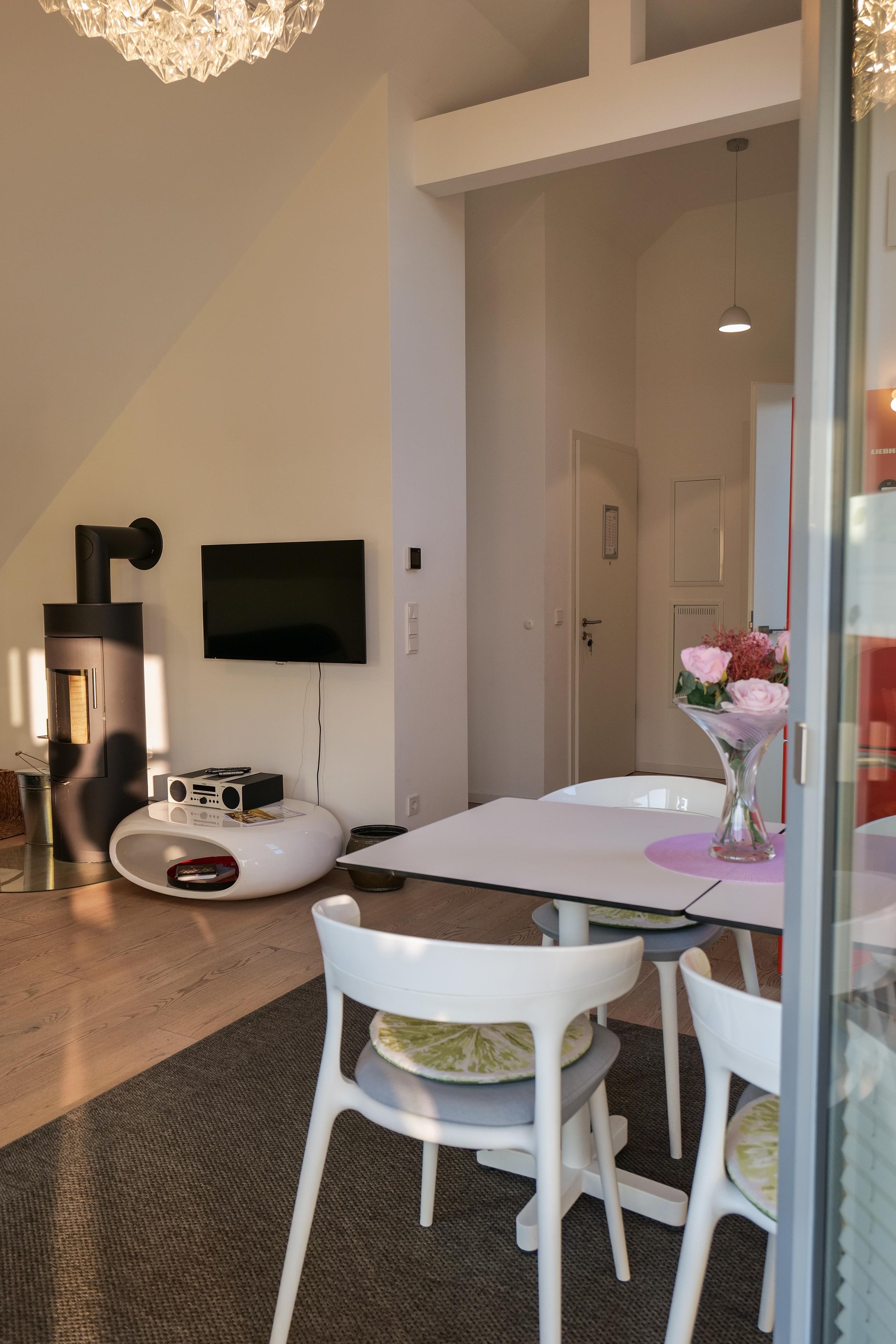 - Das Wohn-Esszimmer hat neben der Glasküche auch Platz für 6 Personen am Esstisch. Auf Wunsch kann man diese Tische zusätzlich mit dem Balkon- und Loggia-Tisch zu einer Tafel für 10 Personen erweitern.