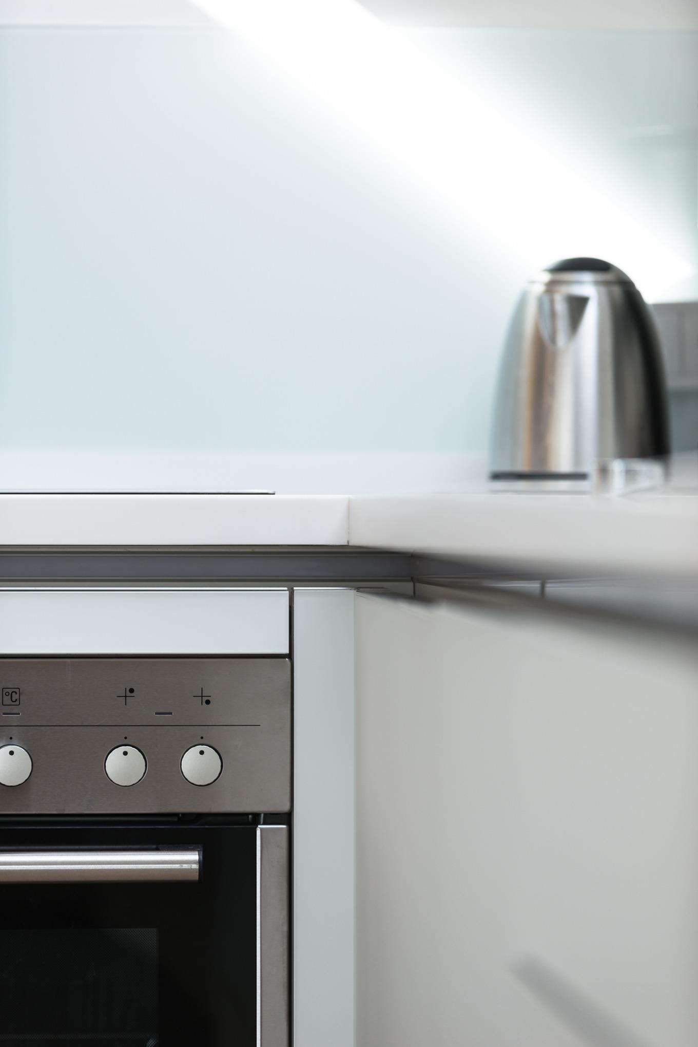 Klares, italienisches Design umgibt Sie, hell und reduziert. Original Kunst von "Hotte" schafft Raum für Kreativität. Die Küche ist aus satiniertem weißem Glas und kommt ohne Oberschränke aus.