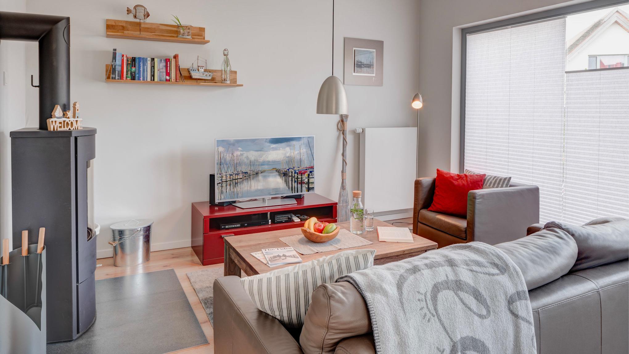 Zwei Schlafzimmer, Wohnzimmer mit Sitzecke, Essecke, Flatscreen-TV, CD-Spieler und Radio. Die integrierte Küchenzeile ist mit einem 4-Platten-Ceranfeld, Backofen, Dunstabzug, Geschirrspüler, Kühlschrank mit Gefrierfach und sämtlichen Zubehör ausgestattet. Das helle und moderne Interieur überzeugt mit einem eleganten Design in moderner Ausstattung. Ein holzbefeuerter Kaminofen und der Blick auf den Binnensee lässt Ihren Aufenthalt zu einem erholsamen Urlaub werden.