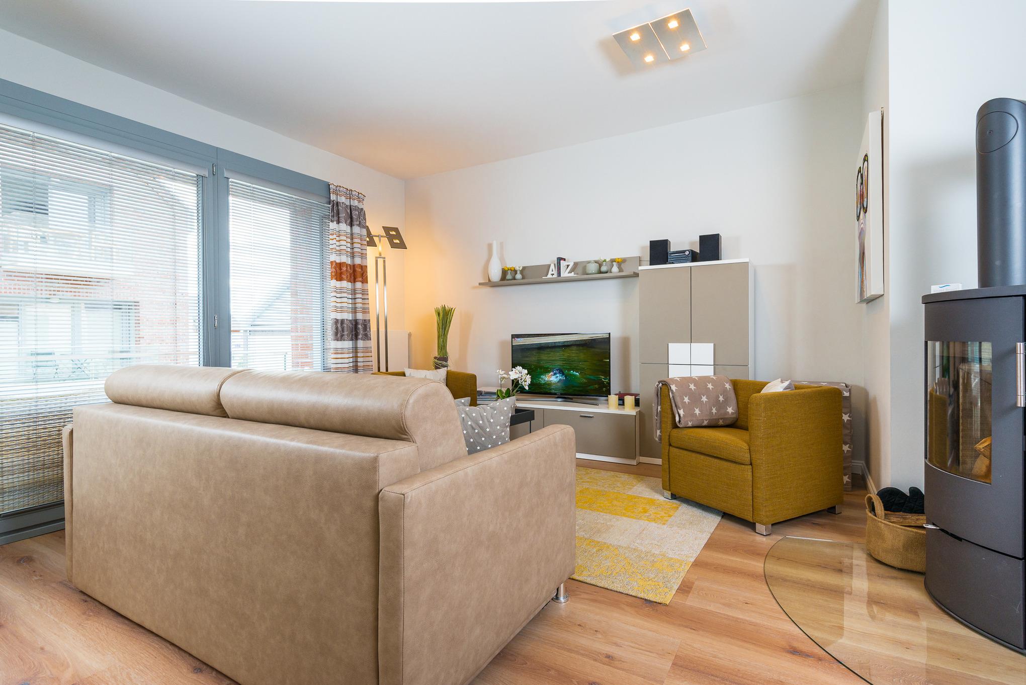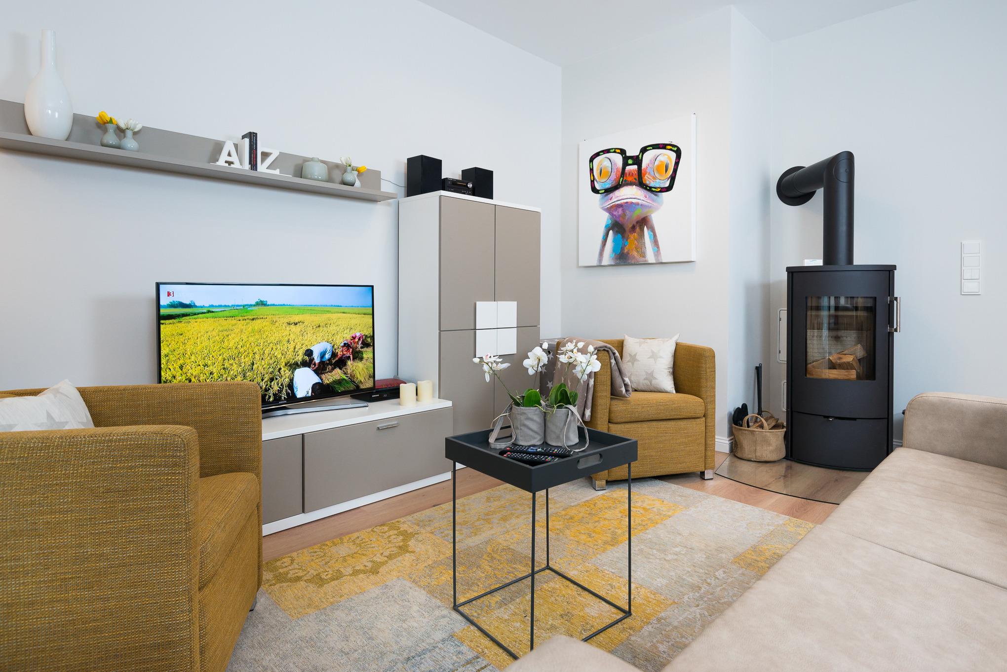Im Wohnzimmer genießen Sie ruhige Momente und schauen Ihre Lieblingsserie im Fernsehen, dieser ist ein moderner Smart-Flachbildschirm Fernseher, der ebenfalls mit einem Blue-Ray Player ausgestattet ist. Gerne können Sie die vorhandene Spiele-Sammlung benutzen und wenn es etwas kälter draußen sein sollte, kann das flackerende Feuer im Kamin für eine wohlige Wärme und eine Wie-Zuhause-Atmosphäre sorgen. Ihre eigene CD‘s können Sie gerne über die Musikanlage abspielen oder Sie hören Internetradio. Natürlich kann auch ein USB-Stick abgespielt werden.