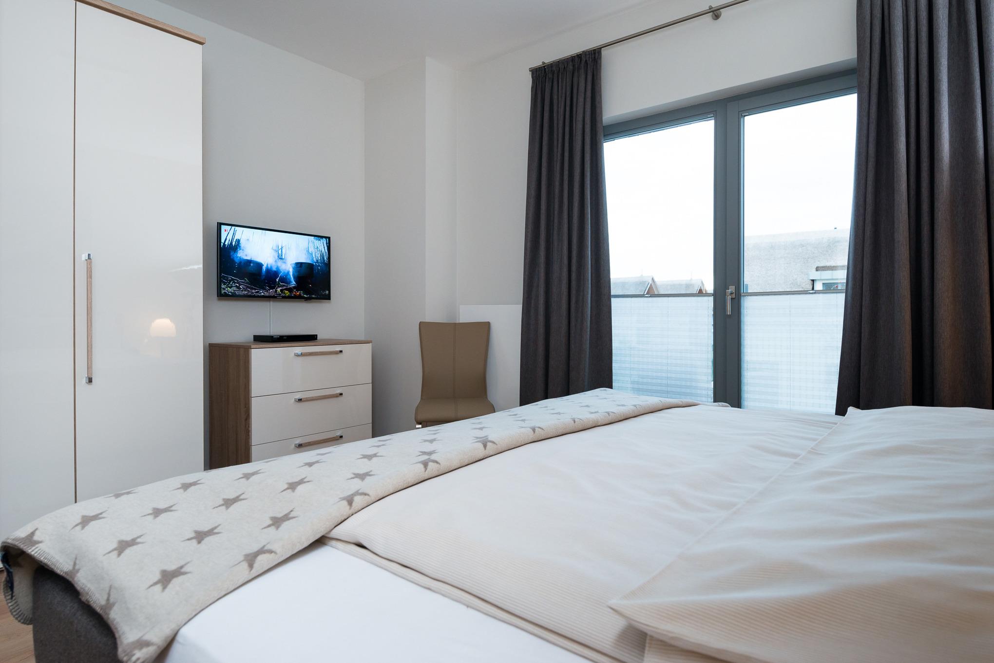 Das Schlafzimmer ist ausgestattet mit einem großen Boxspringbett und der angrenzend windgeschützten Balkon bietet die Möglichkeit morgens in der Sonne die erste leckere Tasse Kaffee oder Tee zu genießen. Lassen Sie hier Ihren Blick über die schönen Reetdach Häuser schweifen und erhaschen Sie sich einen ersten Blick auf die Ostsee, das Naturschutzgebiet "Graswarder" und den Yachthafen. Besser kann ein Tag nicht anfangen!