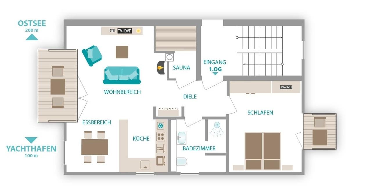Der windgeschützte Balkon im Wohnzimmer lädt ein, um die Mittagssonne so richtig zu genießen, mit Blick auf die Yachthafen und die Ostsee. Auch abends lässt es sich hier, windgeschützt, sehr gut verweilen bei zum Beispiel einem schönen Glas Wein.