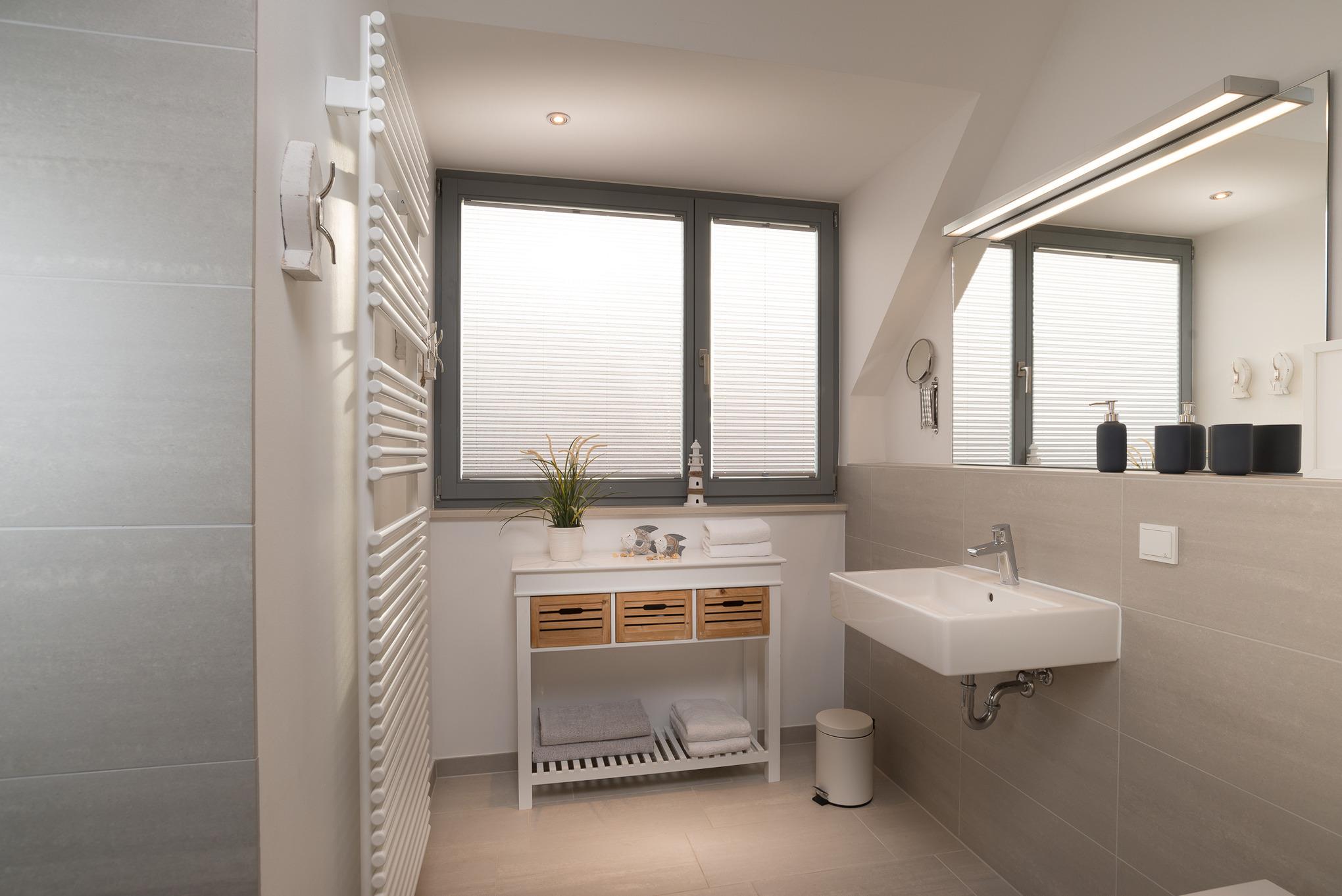 Im Zentrum des Obergeschosses befindet sich auch das Bad, das wie die Sauna eine bodenebene Walk-In-Dusche beinhaltet. Auch hier beflügelt der Ausblick aus dem Fenster.