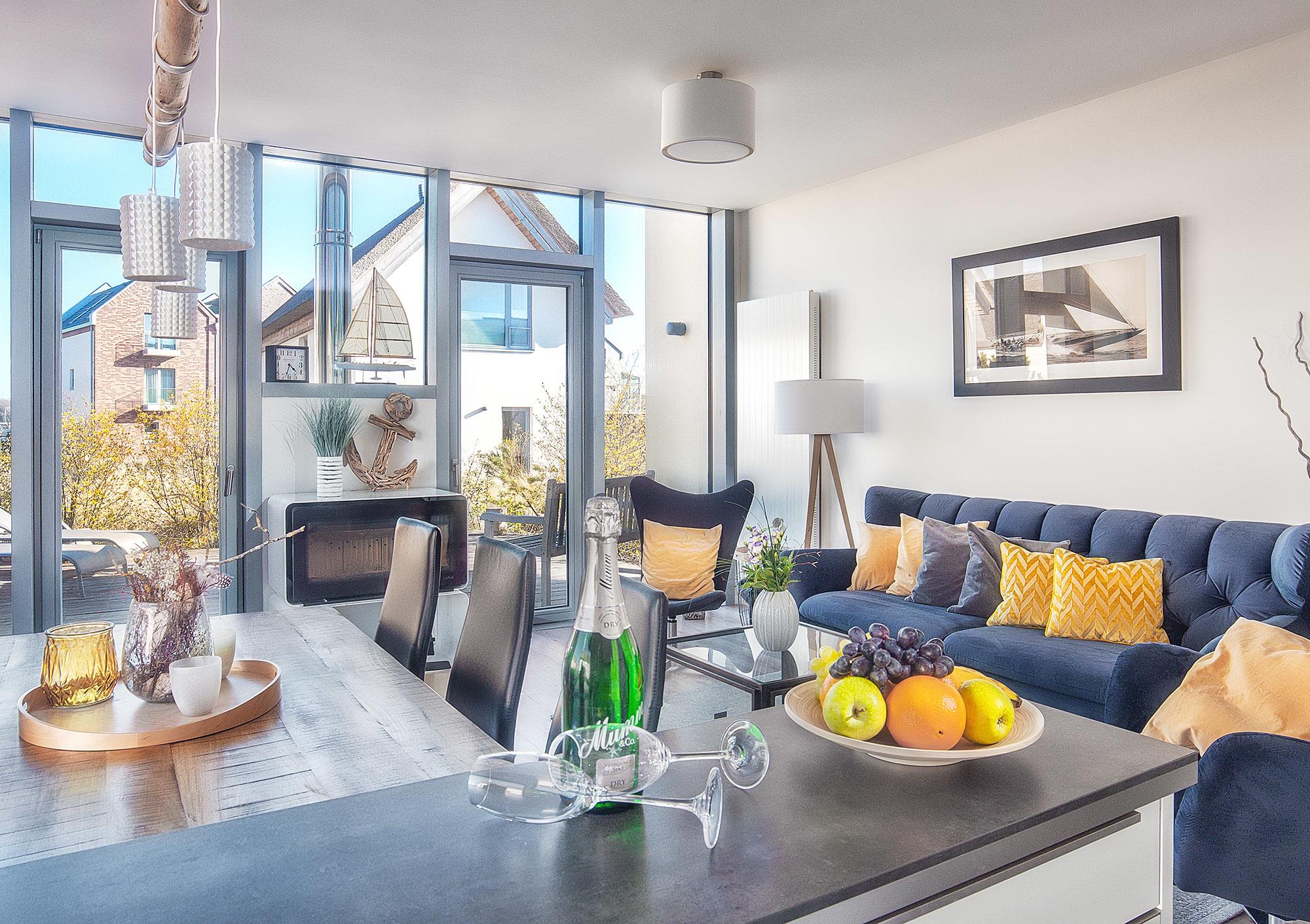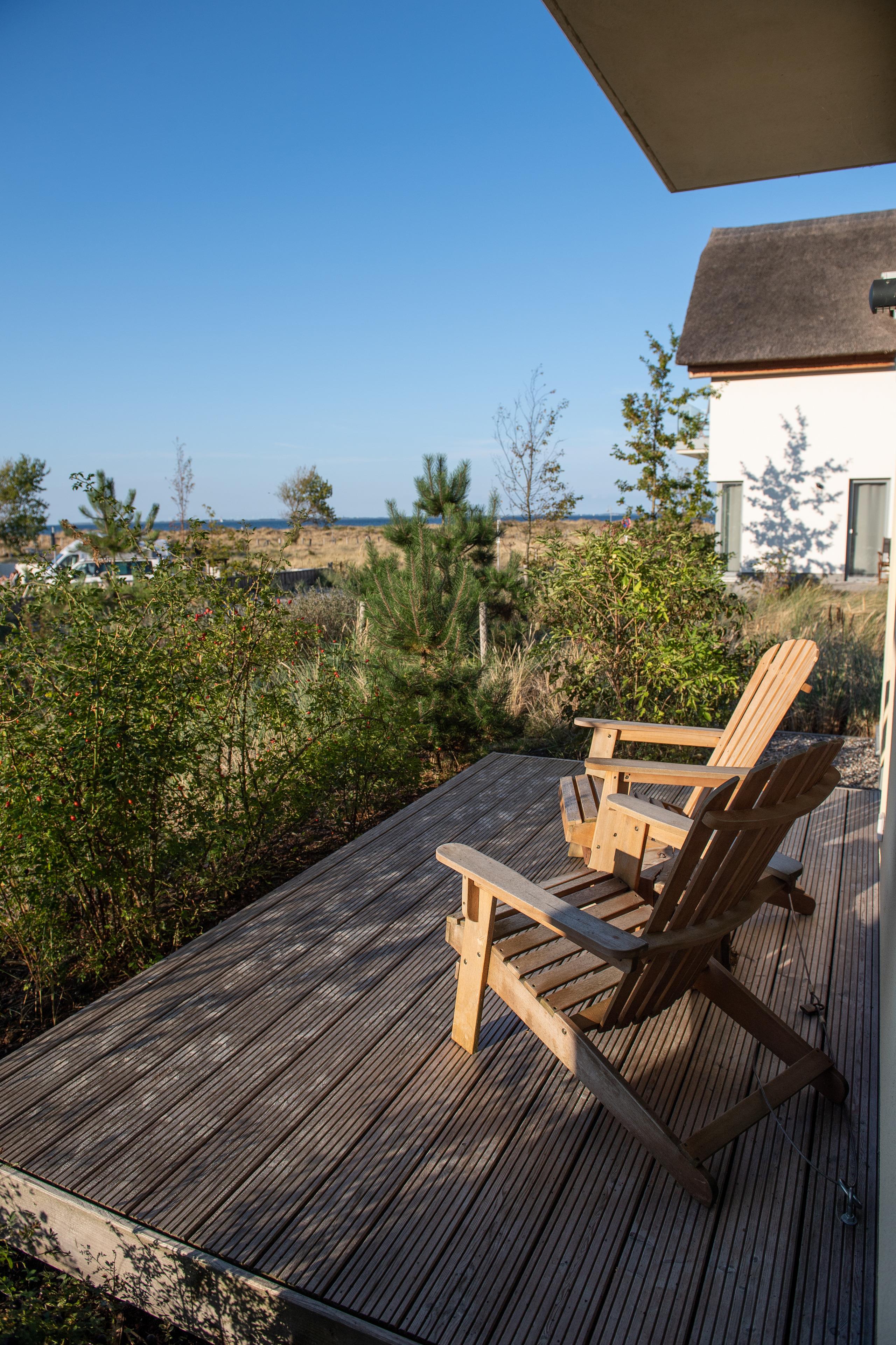 Aus dem Wohnzimmer gelangen Sie auf die große, möblierte Terrasse (Sitzgruppe, Sonnenliegen, Grill) mit herrlichem Blick auf die Dünenlandschaft und den Marina Yachthafen. Sonne von mittags bis zum Sonnenuntergang, rundet dieses wunderschöne Urlaubsdomizil in ruhiger und erster Standlage, angrenzend an das Naturschutzgebiet (Halbinsel-Graswader), ab. Genießen Sie nach einem erholsamen Tag, bei einem Glas Wein oder nach dem Saunagang, die Abendsonne auf der Terrasse.