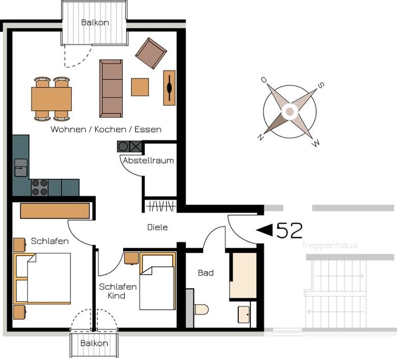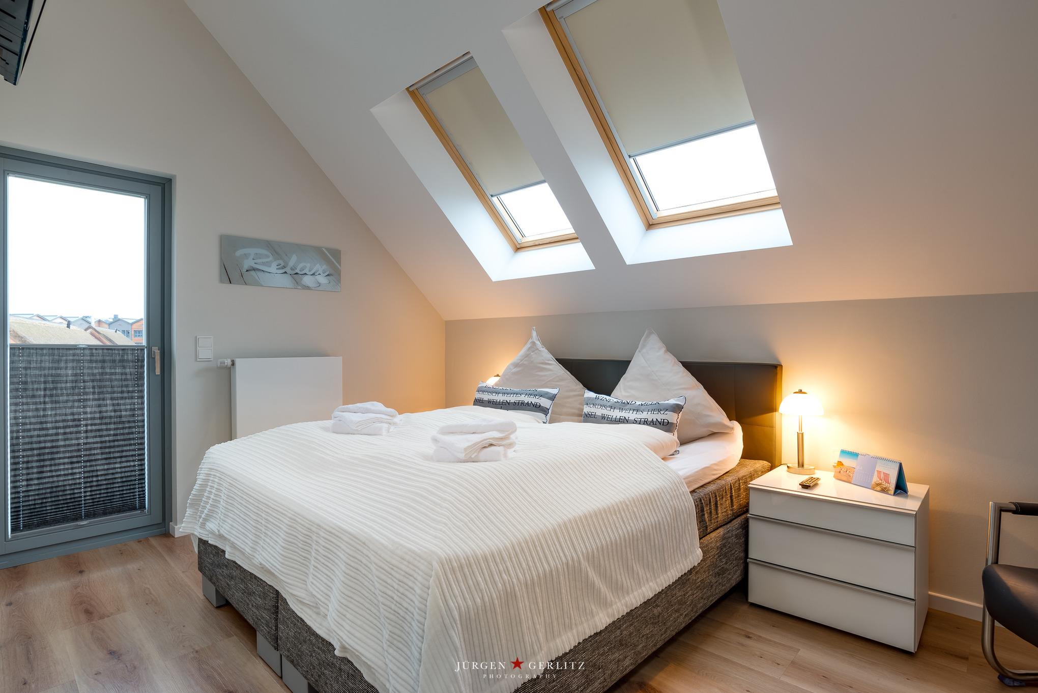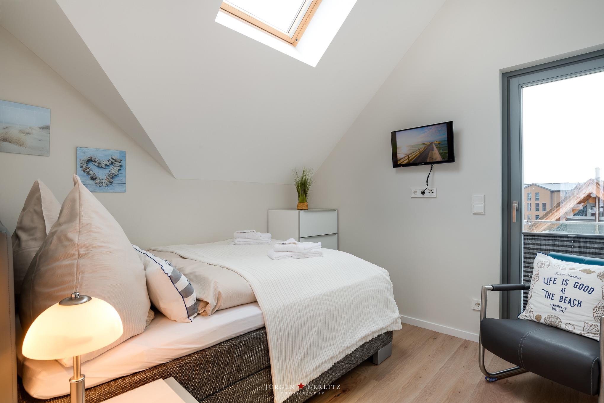 Bei der modern und hochwertig eingerichteten Ferienwohnung handelt es sich um eine helle 2 ½-Zimmer-Dachgeschoßwohnung für 2 – 4 Personen mit 2 Balkonen. Die knapp 70 m² Grundfläche bzw. 63 m² Wohnfläche besteht aus Wohnzimmer, Schlafzimmer, einem kleinen Schlafzimmer und einem komfortablen Bad.