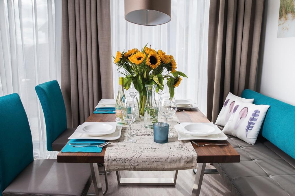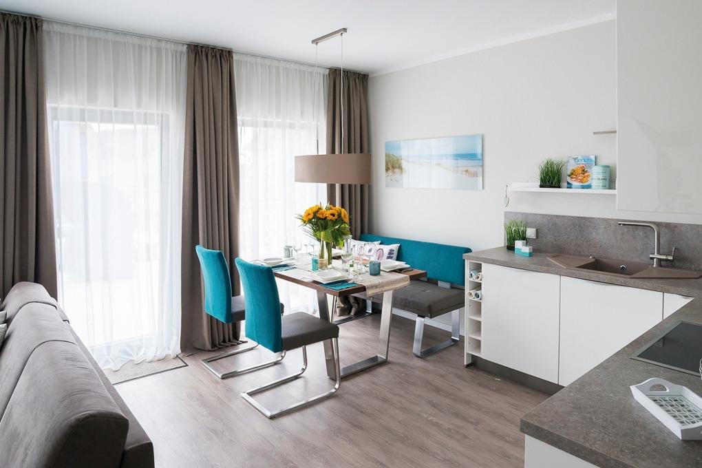 Die auch im Detail geschmackvoll eingerichtete Wohnung hat eine sehr gut ausgestattete, offene Küche, an die sich der Essbereich mit Sitzbank, Stühlen und Massivholztisch anschließt.