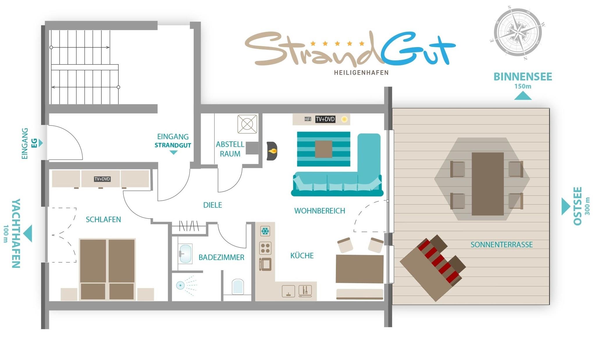 Die modern und komfortabel eingerichtete 5-Sterne-Ferienwohnung liegt in bester Lage von Heiligenhafen im Marina Strand Resort, eingebettet zwischen Ostseestrand im Naturschutzgebiet Graswarder, Marina und Binnensee. Sie hat eine ca. 30 m² große Süd-West-Terrasse mit Blick auf den Binnensee, die zum Verweilen, Sonnenbaden im Strandkorb und Grillen einlädt.