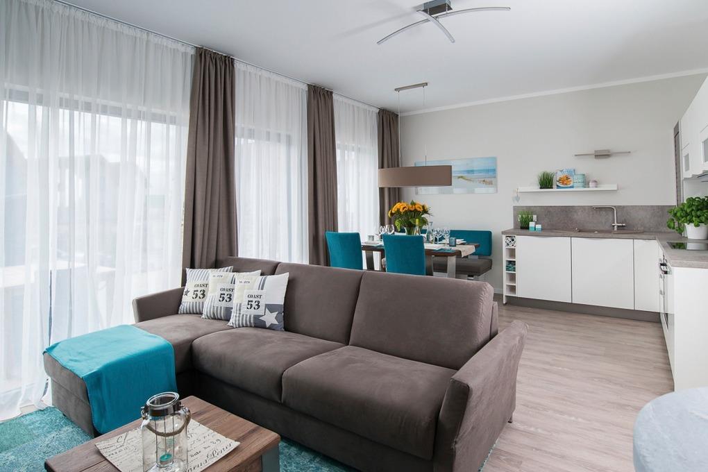 The modern and comfortable furnished 5-star holiday apartment is located in a prime location at the Marina Strand Resort, embedded between the Baltic Sea coast at the nature reserve "Graswerder", Marina and a lake. The apartment comes along with an about 30 m2 large south-west facing terrace with a beautiful lake view providing a restful atmosphere for you to relax, sunbathe in a wicker beach chair and have barbecues.