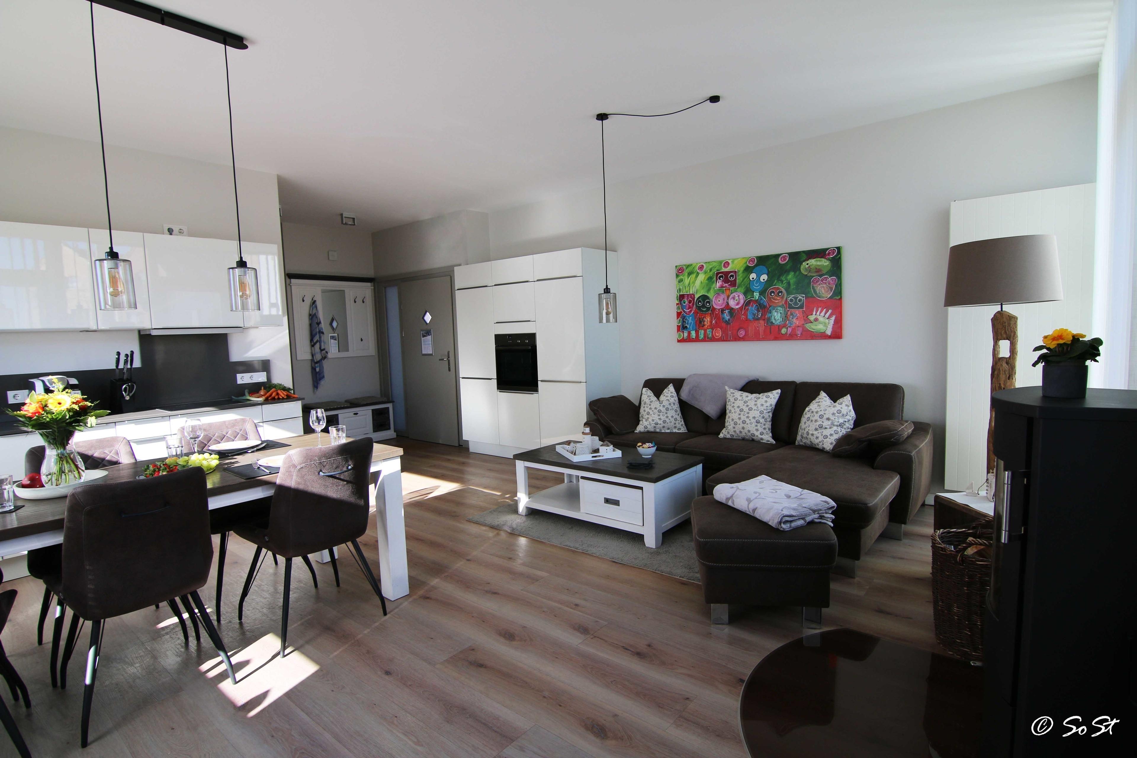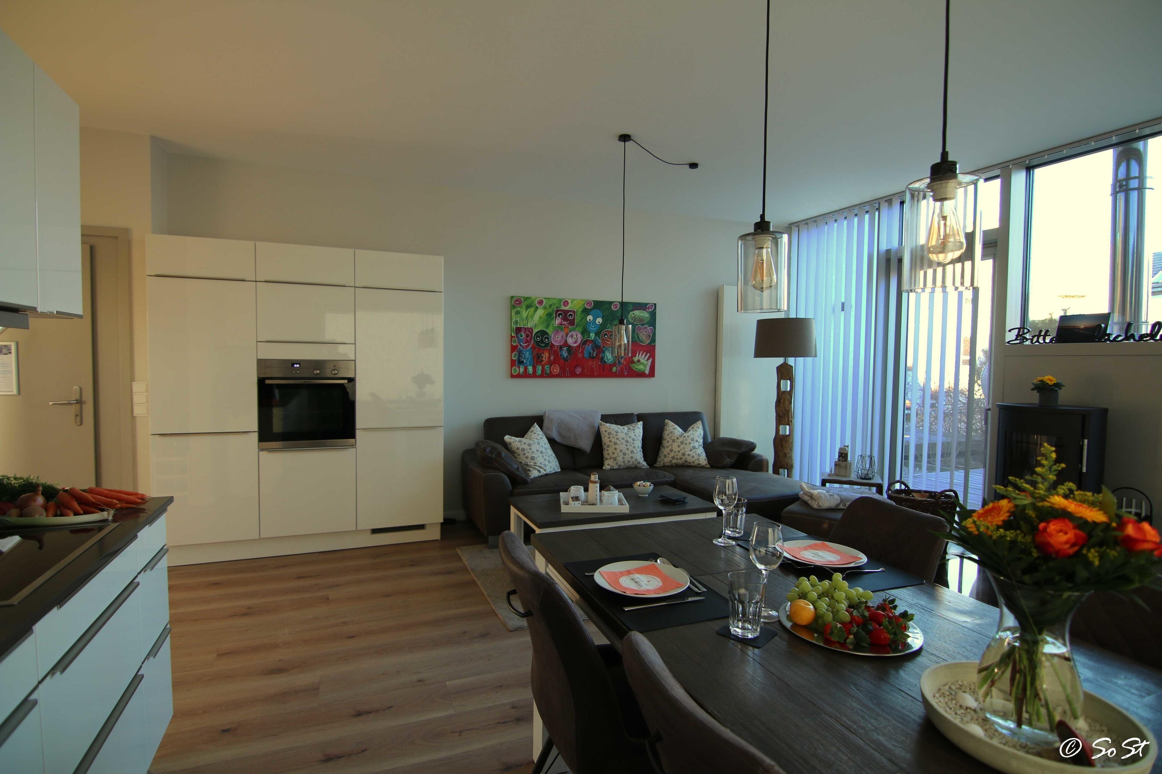 Hier trifft maritimer Charme auf modernen Wohnkomfort. Im großzügigen, lichtdurchfluteten Wohnbereich empfängt Sie ein behaglicher Kaminofen, der an kühleren Abenden eine warme Atmosphäre zaubert. Ein Smart-TV und ein Musiksystem sorgen für Unterhaltung, während Sie es sich auf dem Sofa gemütlich machen. Die offene Küche – ausgestattet mit Induktionsherd, Backofen, Mikrowelle, Kaffeemaschine und Tassimo-Kapselmaschine, Toaster und Wasserkocher – wird schnell zum Treffpunkt für gemeinsames Kochen, Lachen und Planen der nächsten Ausflüge. Ein praktischer Waschtrockner steht Ihnen ebenfalls zur Verfügung.