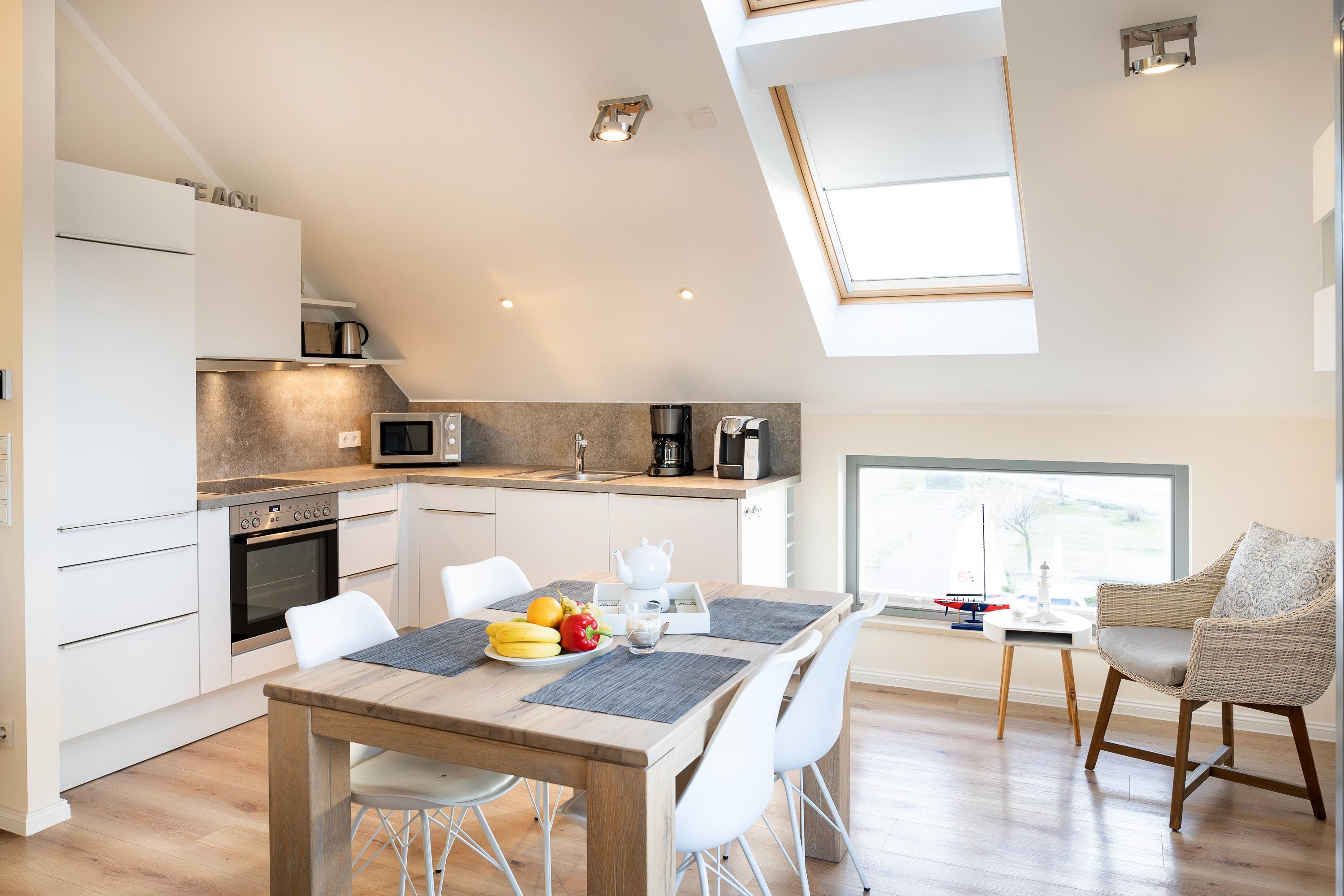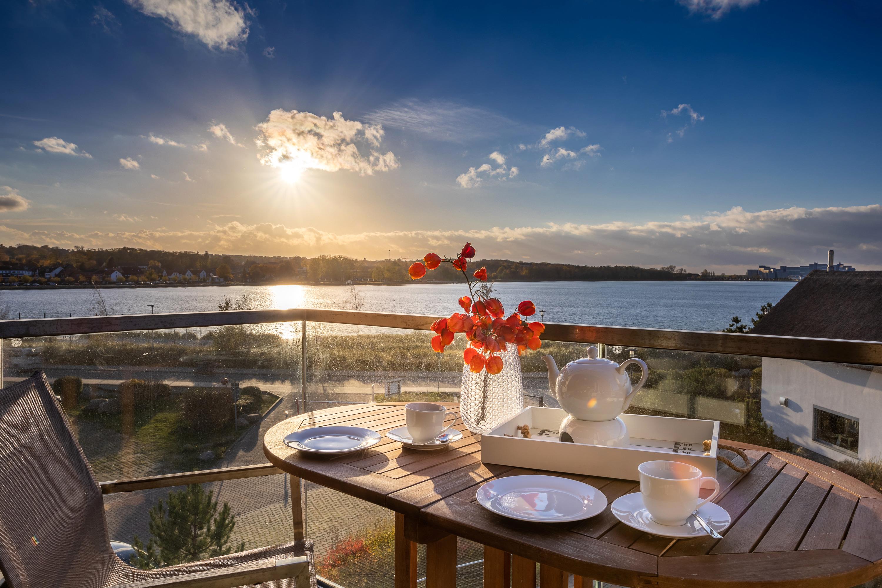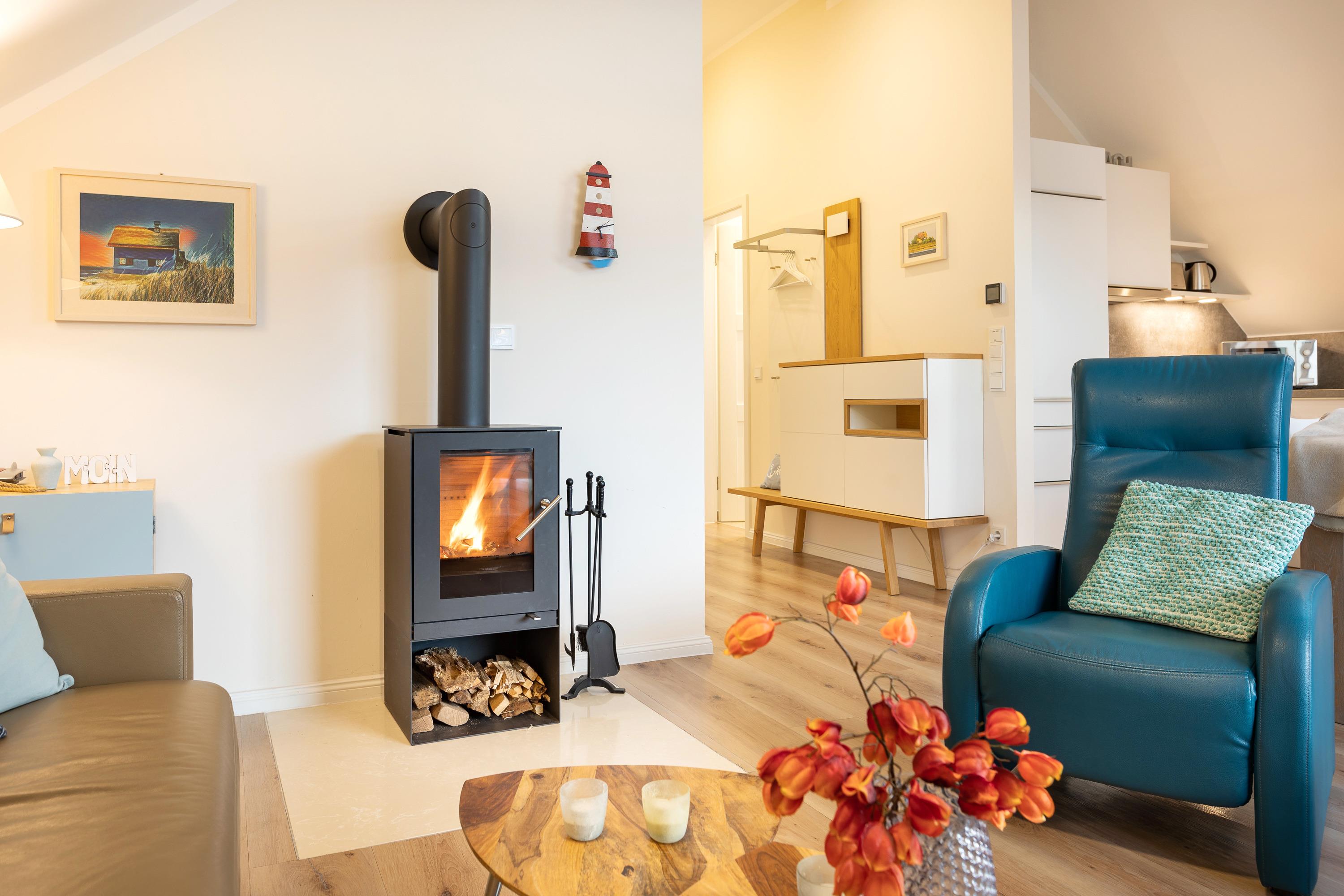 Die Wohnung empfängt Sie im offenen Wohnbereich mit der voll ausgestatteten Küche. Durch die Loggia haben Sie einen tollen Blick über den Binnensee, der große Balkon mit Südwestausrichtung lädt zum Sonnenbaden, Ausruhen und Verweilen ein, und die wunderschönen Sonnenuntergänge lassen sich hier ganz besonders intensiv genießen. In der Winterzeit wärmt Sie das behagliche Kaminfeuer, während Sie sich bei einem Glas Wein am Sonnenuntergang erfreuen.