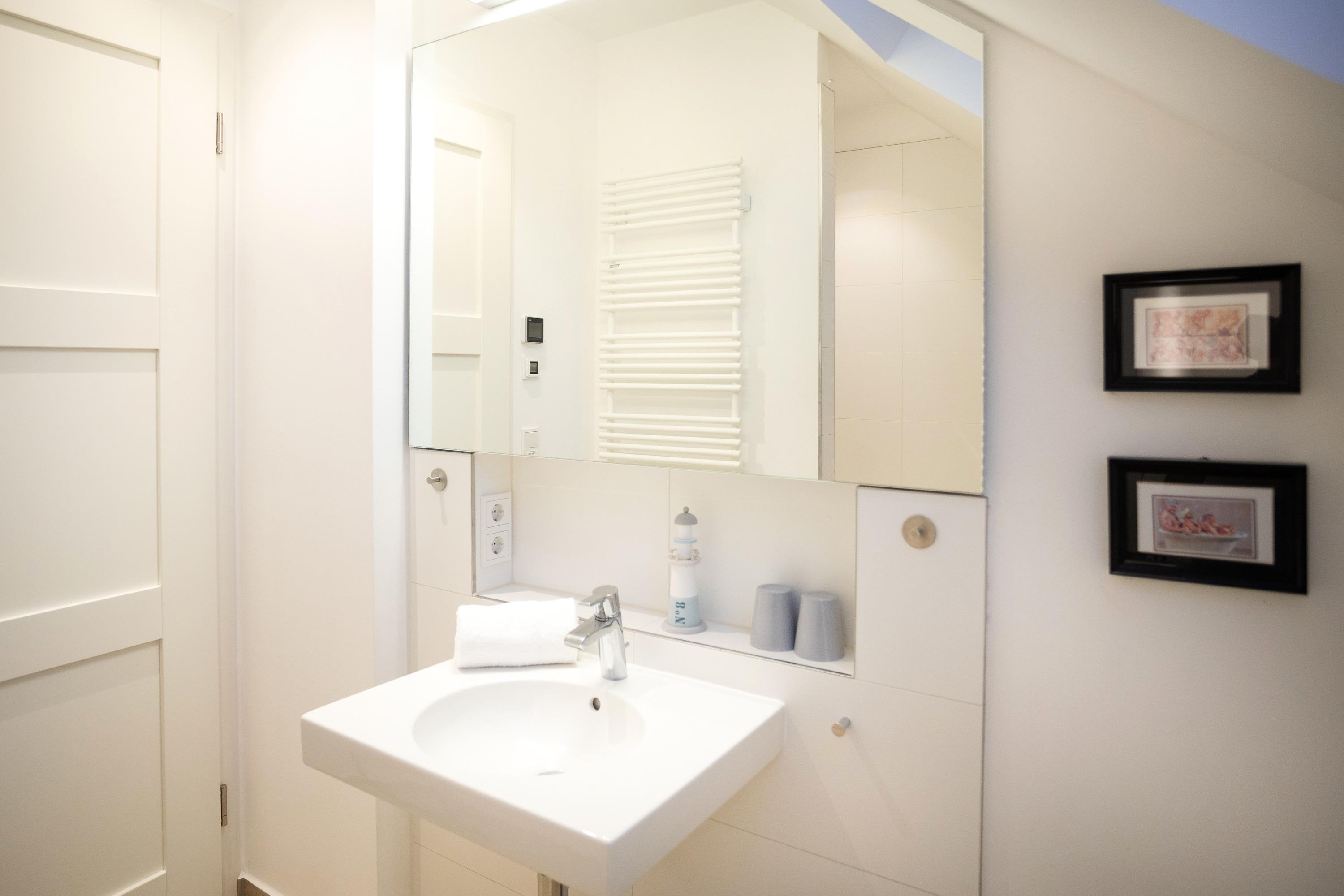 Das Badezimmer ist exklusiv ausgestattet und verfügt über eine große Dusche. Genügend Stauraum finden sie in den Schränken sowie im Abstellraum.