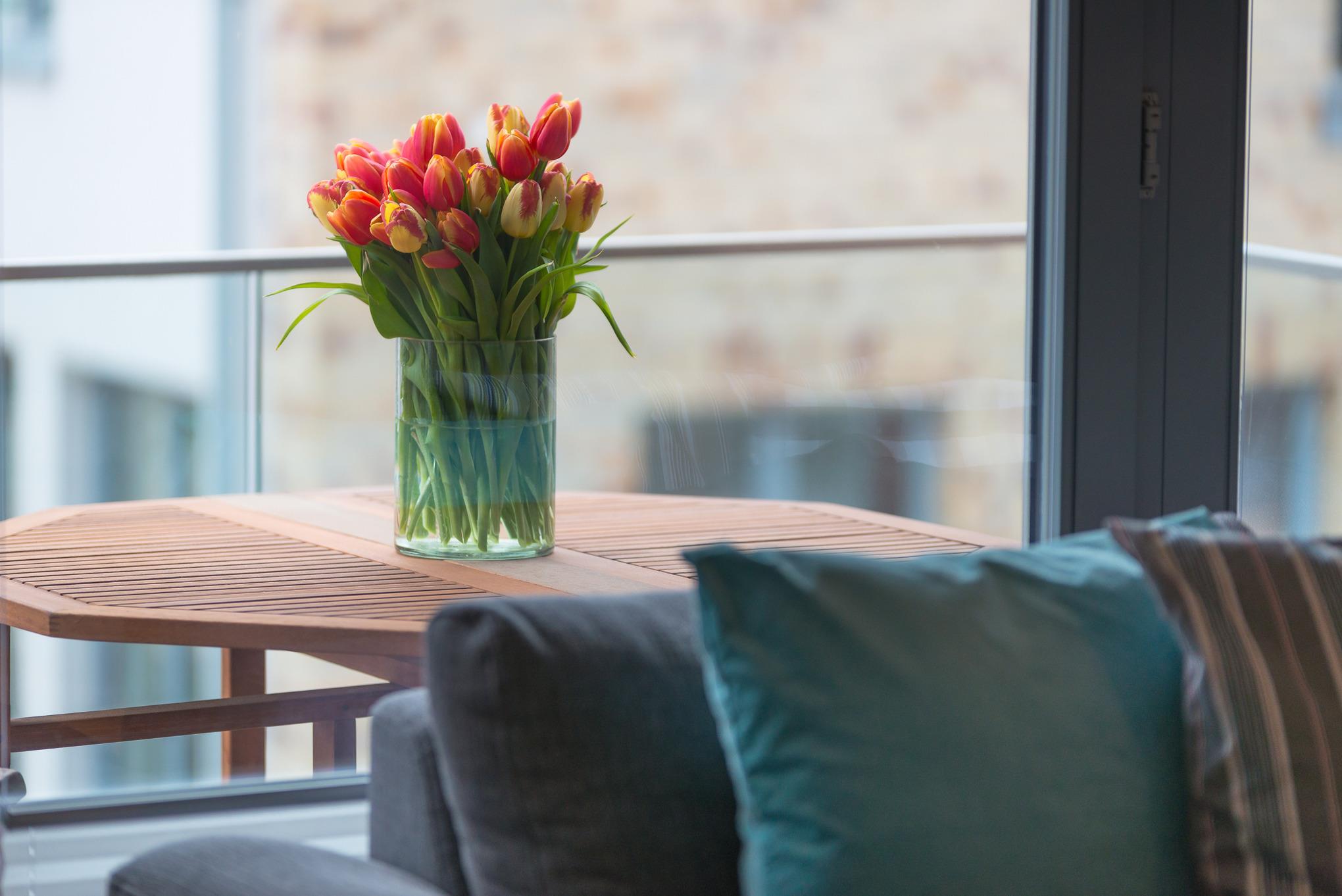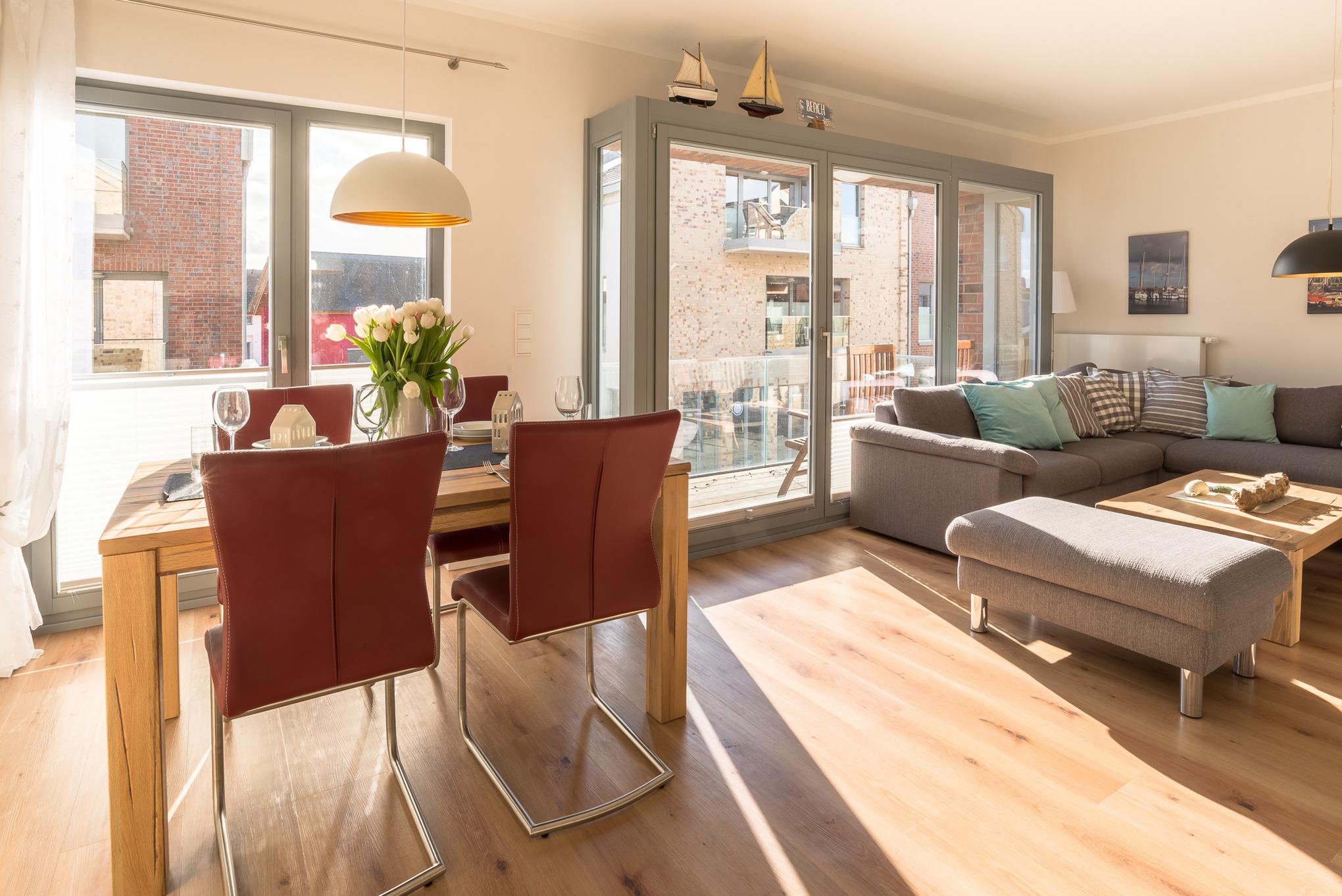 Die Wohnung im 1. Obergeschoss heißt sie mit luftiger, maritimer Helligkeit willkommen. Der offene Wohn-Essbereich mit gut ausgestatteter Appartmentküche lädt Sie zu jeder Jahreszeit zu gemütlichen Stunden vor dem Kamin ein. Vom Wohnzimmer aus betreten Sie die Loggia und haben einen schönen Blick auf Yachthafen, Seebrücke und Meer. Hier können Sie den Sonnenuntergang bei einem Glas Wein genießen!
