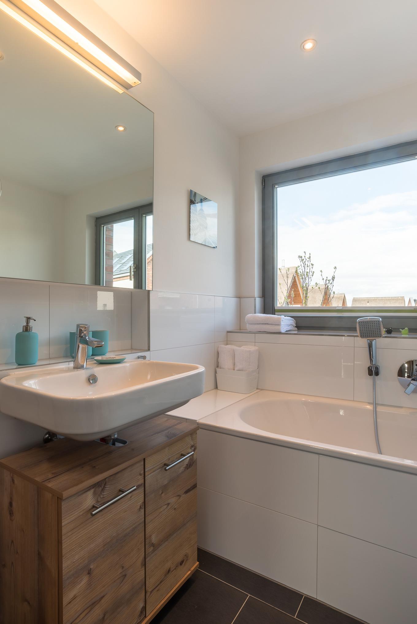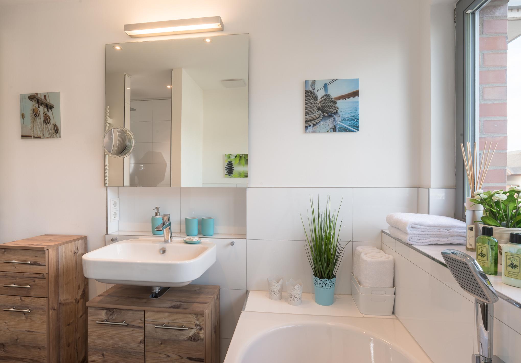 Im hellen Bad können Sie Ihre sandigen Füße in der ebenerdigen Regenwalddusche abwaschen oder ein ausgiebiges, entspanntes Bad nehmen.
