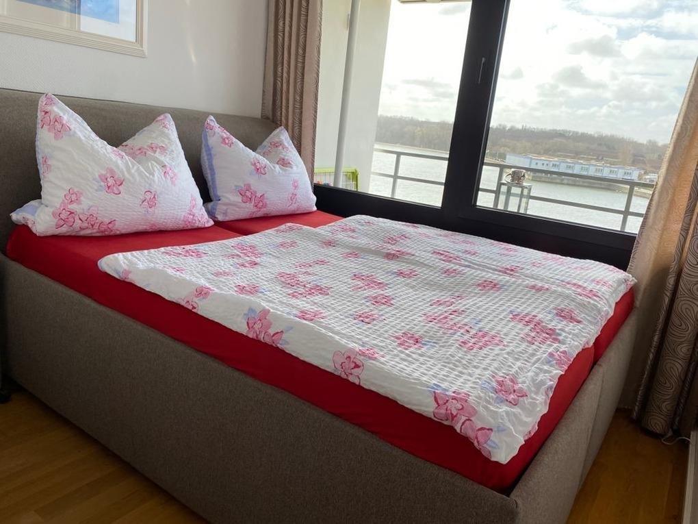 Im Schlafzimmer haben sie vom Boxspringbett (1,6 m x 2 m ) einen Blick auf den Binnensee.
