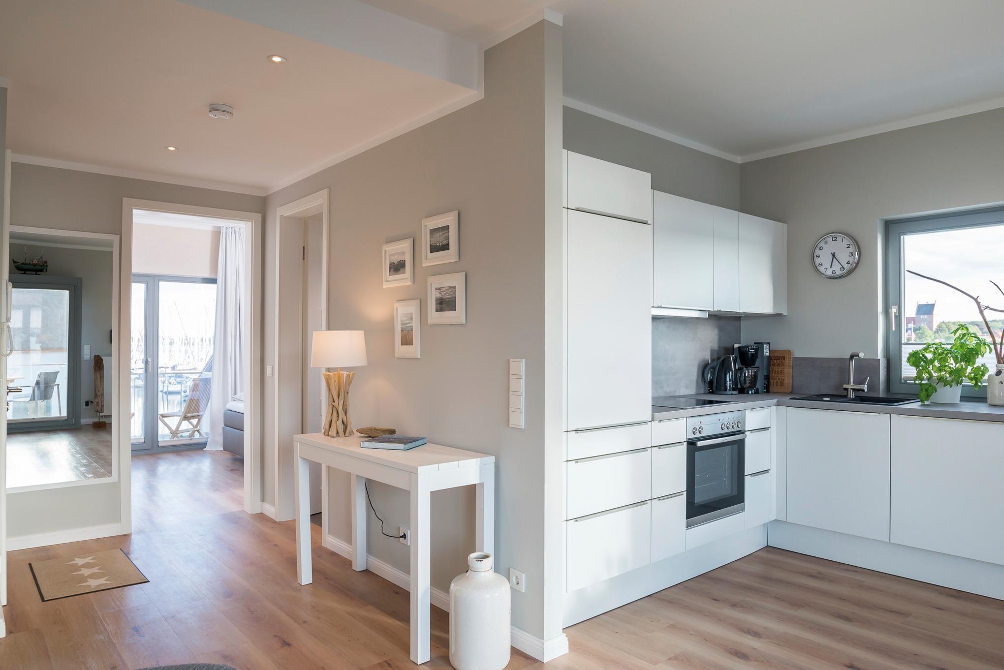 Der lichtdurchflutete Wohn- Essbereich lädt Sie mit seinem komfortablen Lederschlafsofa, zwei gemütlichen Sesseln und einem Kaminofen ein, auch bei schlechtem Wetter eine erholsame Zeit zu verbringen. Im Essbereich mit seinem Massivholztisch genießen Sie die maritimen Köstlichkeiten der Region. Diese bereiten Sie in der angrenzenden hochwertig ausgestatteten Küche zu. Begeistern Sie sich tagsüber für den herrlichen Blick auf die Stadt Heiligenhafen, die Marina und den Binnen- See und genießen Sie am Abend die herrlichen Sonnenuntergänge auf dem Balkon.