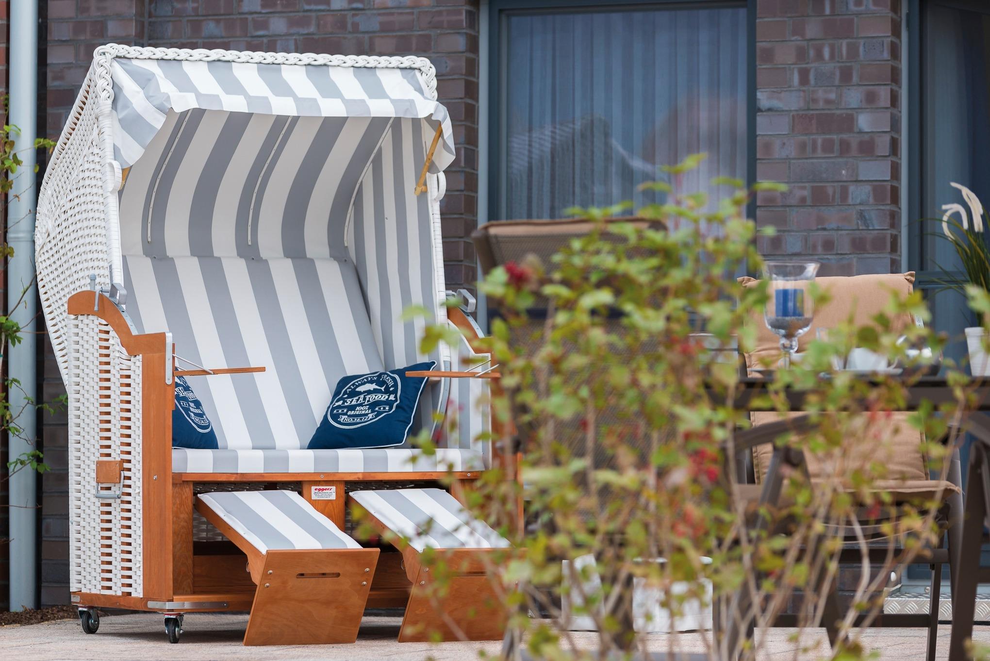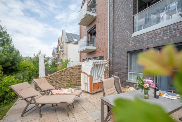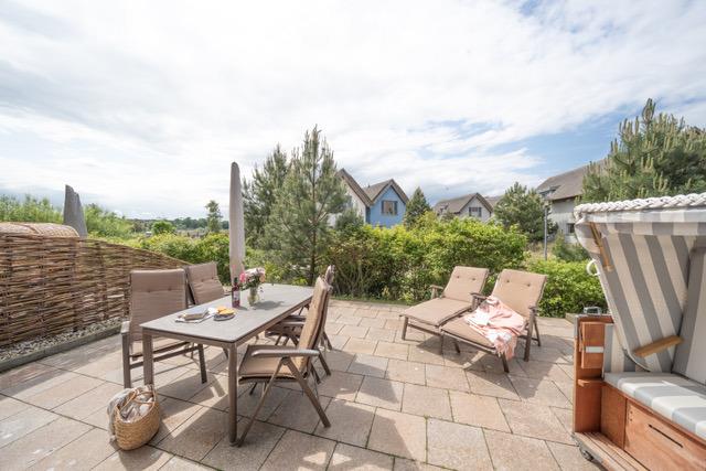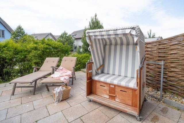 Die 30 qm große und von Dünengras umgebene Süd-West-Terrasse mit Blick auf den Binnensee lädt zum Verweilen und Entspannen ein. Die großzügige Ausstattung mit Strandkorb, Sonnenliegen, Sonnenschirm und ausreichenden Sitzmöglichkeiten lassen kaum Wünsche offen.