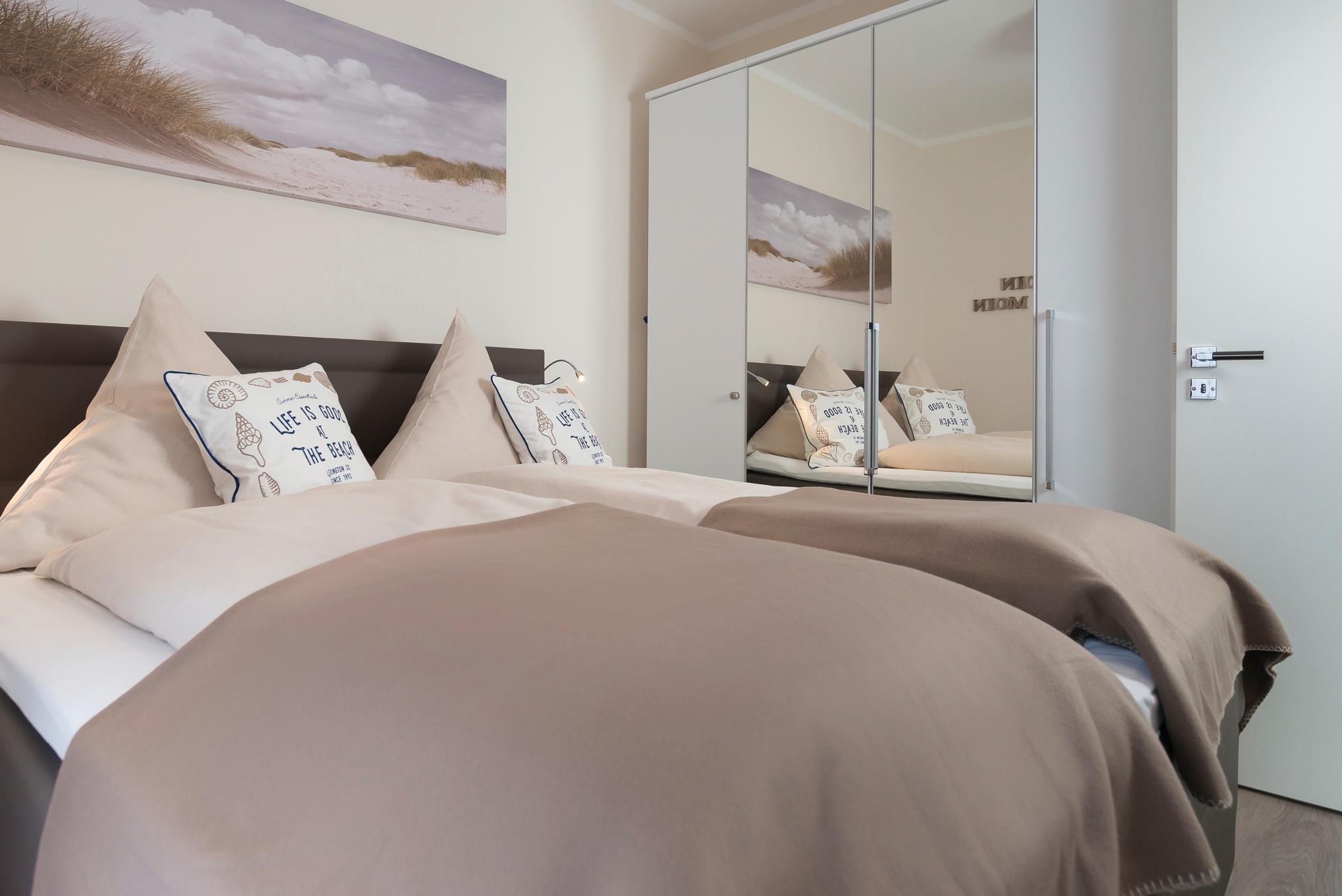 Das Schlafzimmer verfügt über ein komfortables Boxspring-Doppelbett, einen großen Kleiderschrank und einen Flachbildfernseher.