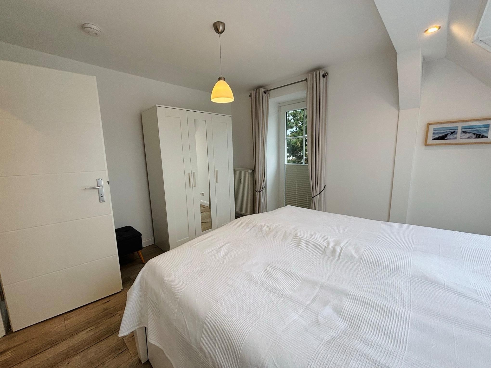 Dieses Appartement wirkt sehr hell mit seinen vielen Fenstern und bodentiefen Balkontüren. Ein besonders Flair entsteht durch die Dachbalken im Landhausstil.