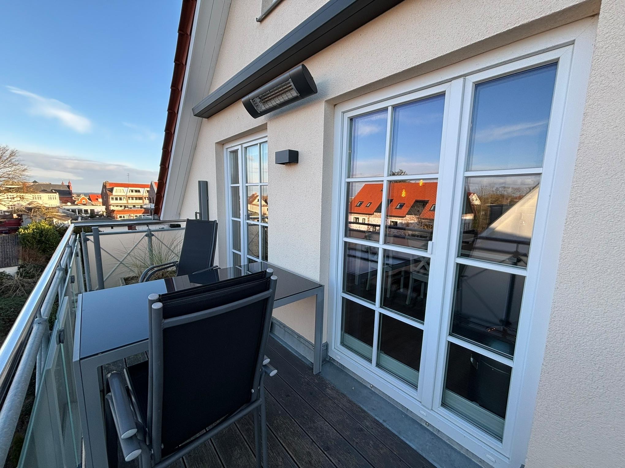 Der Balkon, der mit einer elektrischen Markise und einem Heizstrahler ausgestattet ist lädt zu geselligen Abenden ein. Durch den Heizstrahler können Sie den Außenbereich auch an kühleren Tagen in vollen Zügen genießen.