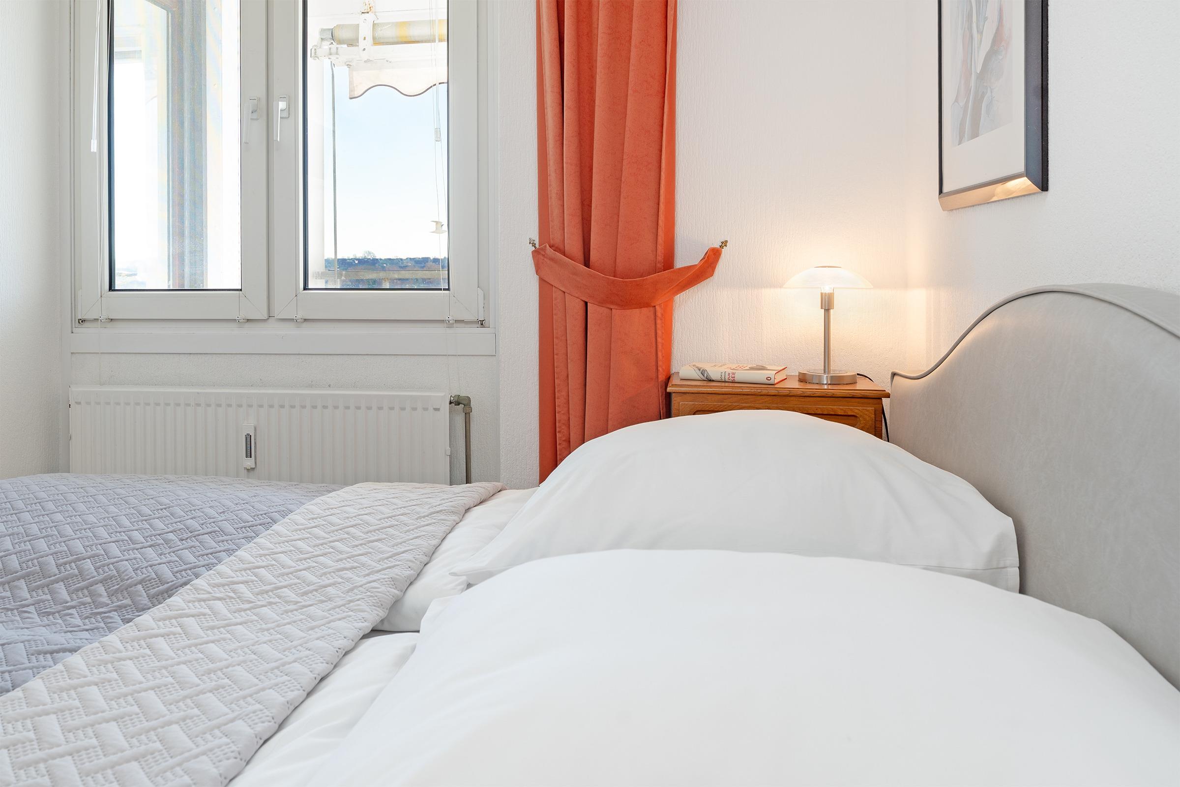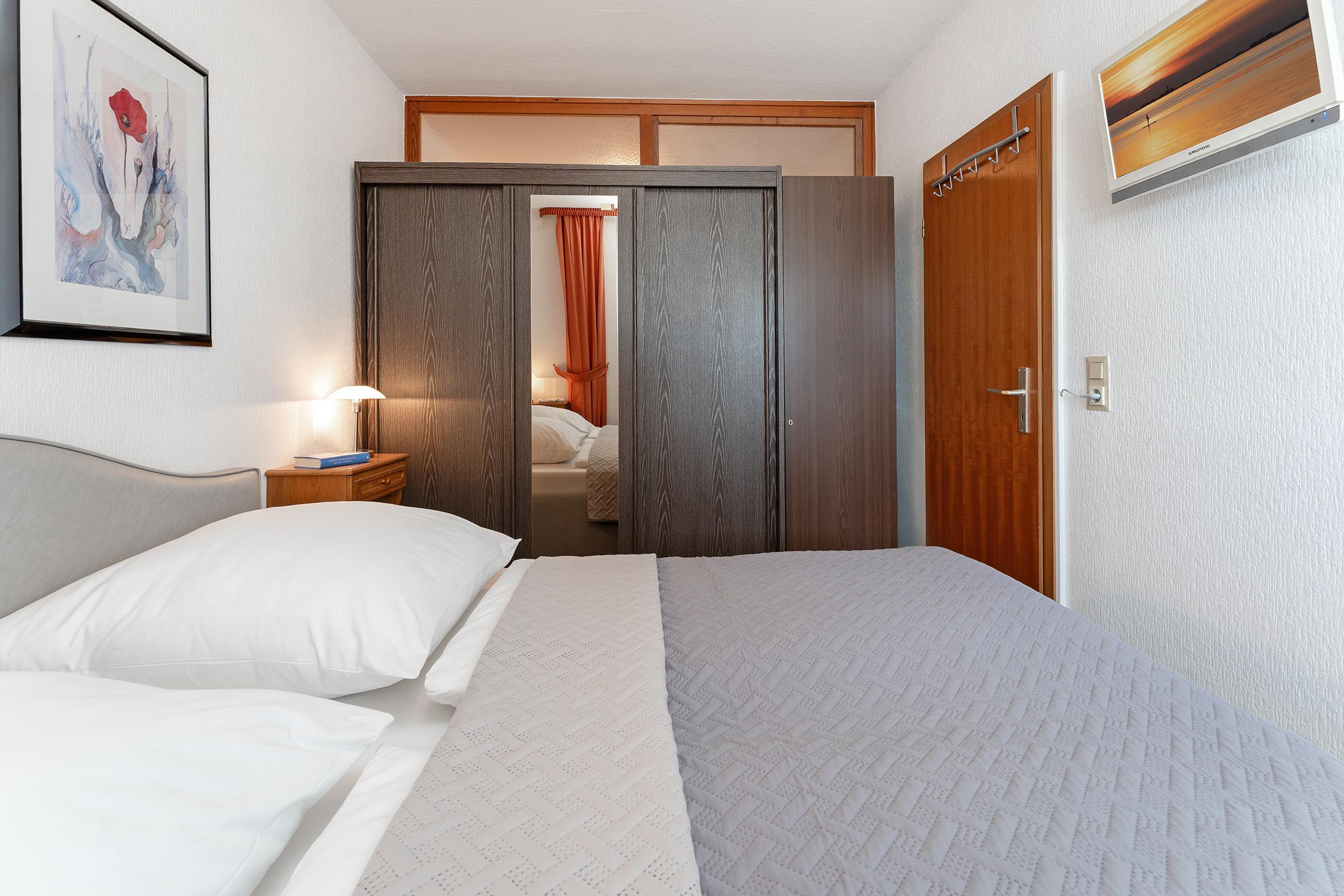 Schlafzimmer 1: 1 Doppelbett (2x 90x200 cm), Kleiderschrank, TV, Verdunkelung: Gardinen & Jalousien, kein Platz für ein Babybett vorhanden