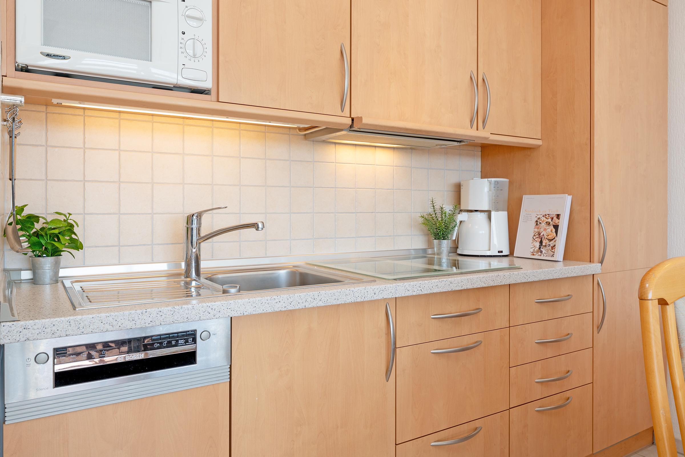 Die offene Küche ist bestens ausgestattet und bietet einen Cerankochfeldherd, einen Kühlschrank mit Gefrierfach, eine Kaffeemaschine sowie einen Toaster. Der angrenzende Essbereich bietet ausreichend Platz für gemeinsame Mahlzeiten mit der Familie oder Freunden.
