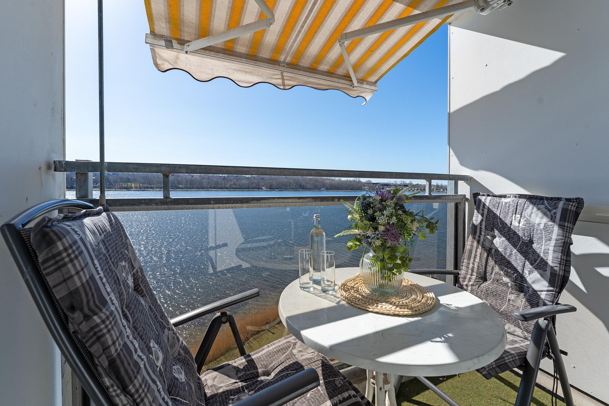 Vom Wohnzimmer aus gelangen Sie auf den überdachten Balkon, der sich perfekt für ein gemütliches Frühstück oder einen ruhigen Abend bei Sonnenuntergang eignet. Der Blick auf den Binnensee sorgt für eine erholsame Auszeit in einer einzigartigen Umgebung.