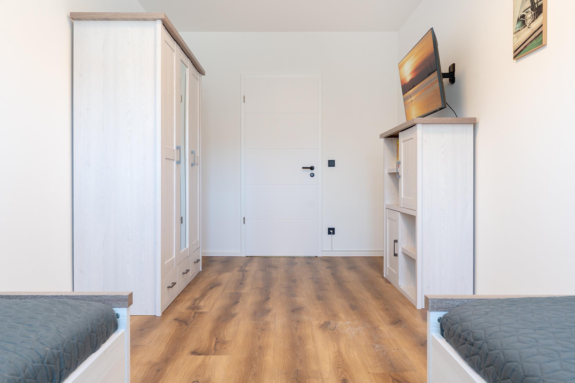 Schlafzimmer 3: 2 Einzelbetten (2x 90x200 cm), 1 Schlafsofa (120x200 cm), Kleiderschrank, Verdunkelung: Verdunkelungsplissees und -vorhänge, Platz für ein Babybett vorhanden