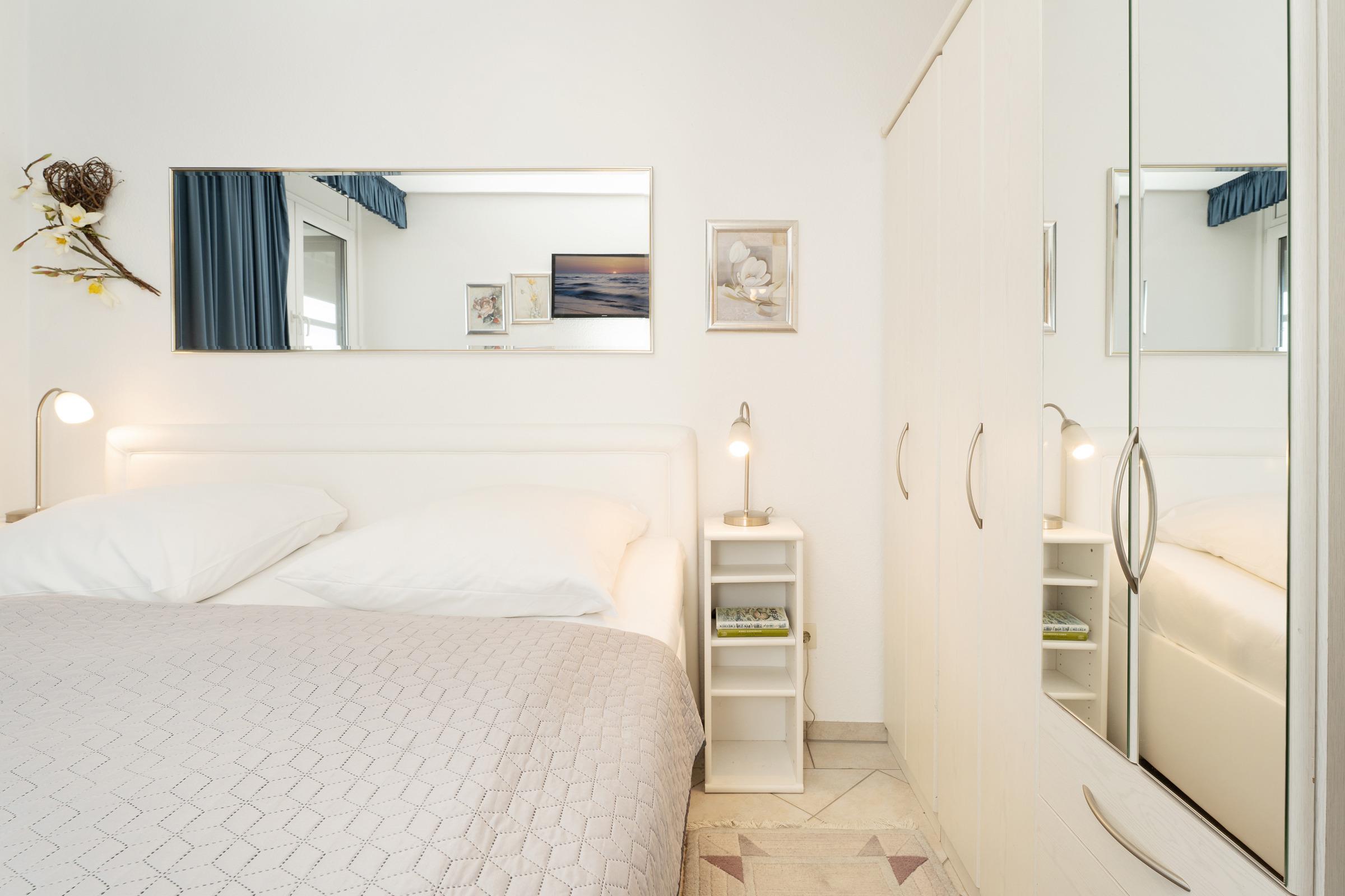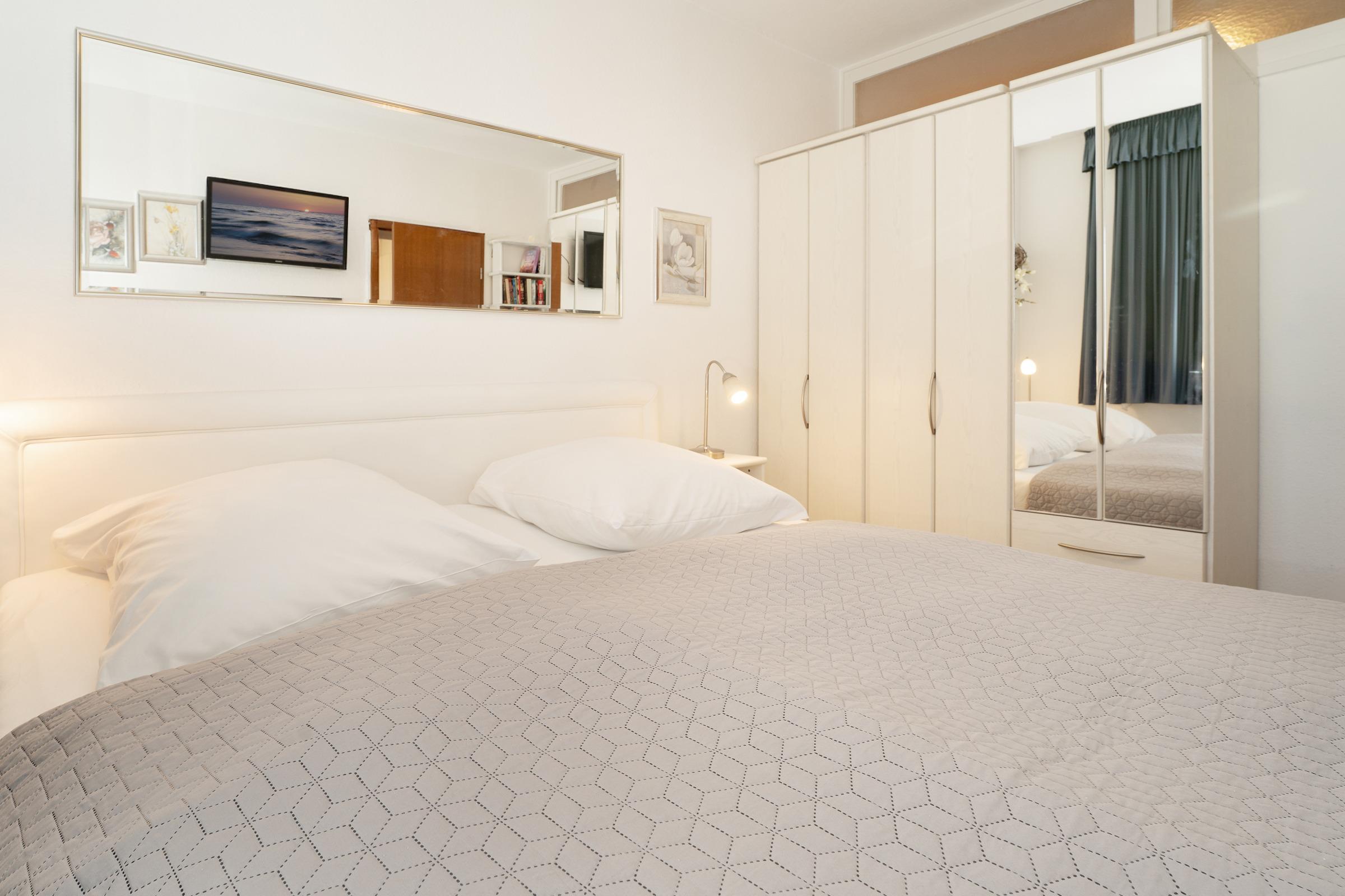 Schlafzimmer 1: 1 Doppelbett (2x 90x200 cm), Kleiderschrank, TV, Verdunkelung: Gardinen, kein Platz für ein Babybett vorhanden