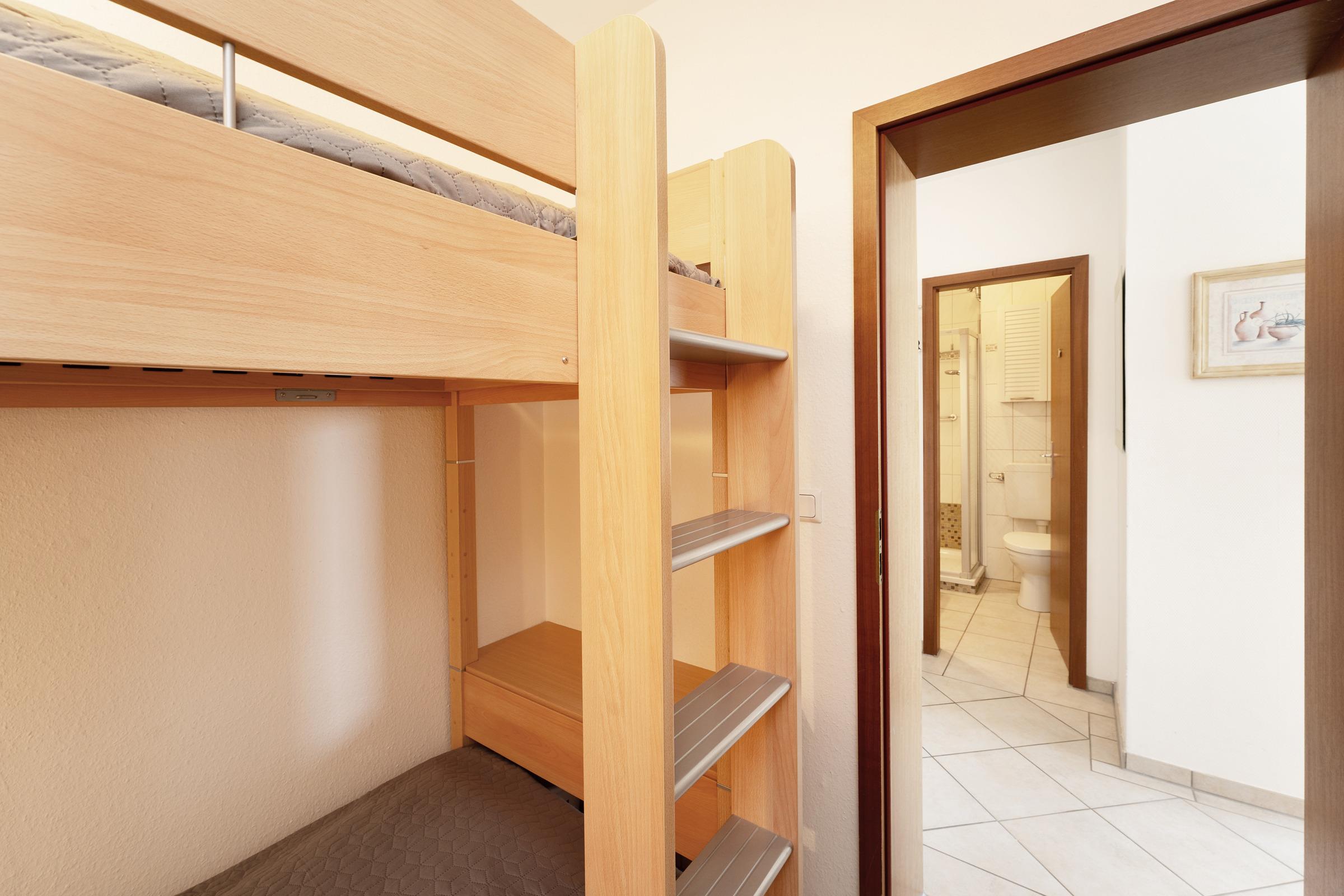 Schlafzimmer 2: 1 Etagenbett (2x 90x200 cm), Kleiderschrank, Oberlichtfenster zum Schlafzimmer ohne Verdunkelung, kein Platz für ein Babybett vorhanden