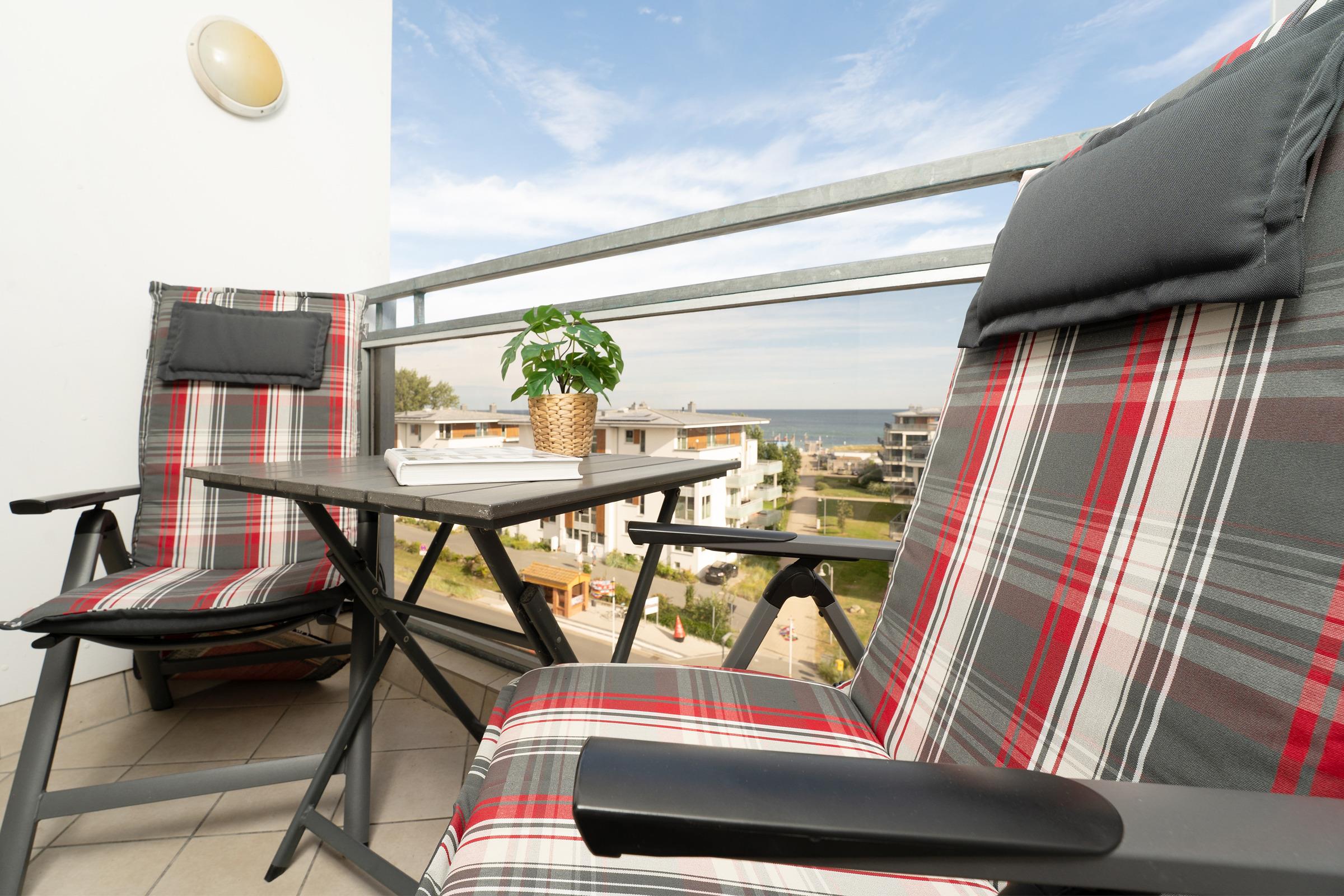 Der lichtdurchflutete Wohnbereich lädt mit gemütlicher Sofaecke, Fernseher und Radio zum Ausklang des Tages ein. Vom Wohnraum aus betreten Sie den sonnigen Balkon mit Blick auf die Ostsee – perfekt für Mahlzeiten an der frischen Luft. Die Küchenzeile bietet alles, was Sie brauchen: Ceranfeld (4 Kochzonen), Backofen, Mikrowelle, Kühlschrank, Gefrierschrank, Geschirrspüler, Kaffeemaschine, Wasserkocher und Toaster. Der Essbereich bietet Raum für gemeinsame Mahlzeiten. Im großen Schlafzimmer erwartet Sie ein Doppelbett und ein TV, das zweite Schlafzimmer ist mit Etagenbett ideal für Kinder. Das Bad verfügt über eine Dusche mit 13 cm Einstiegshöhe sowie ein WC.