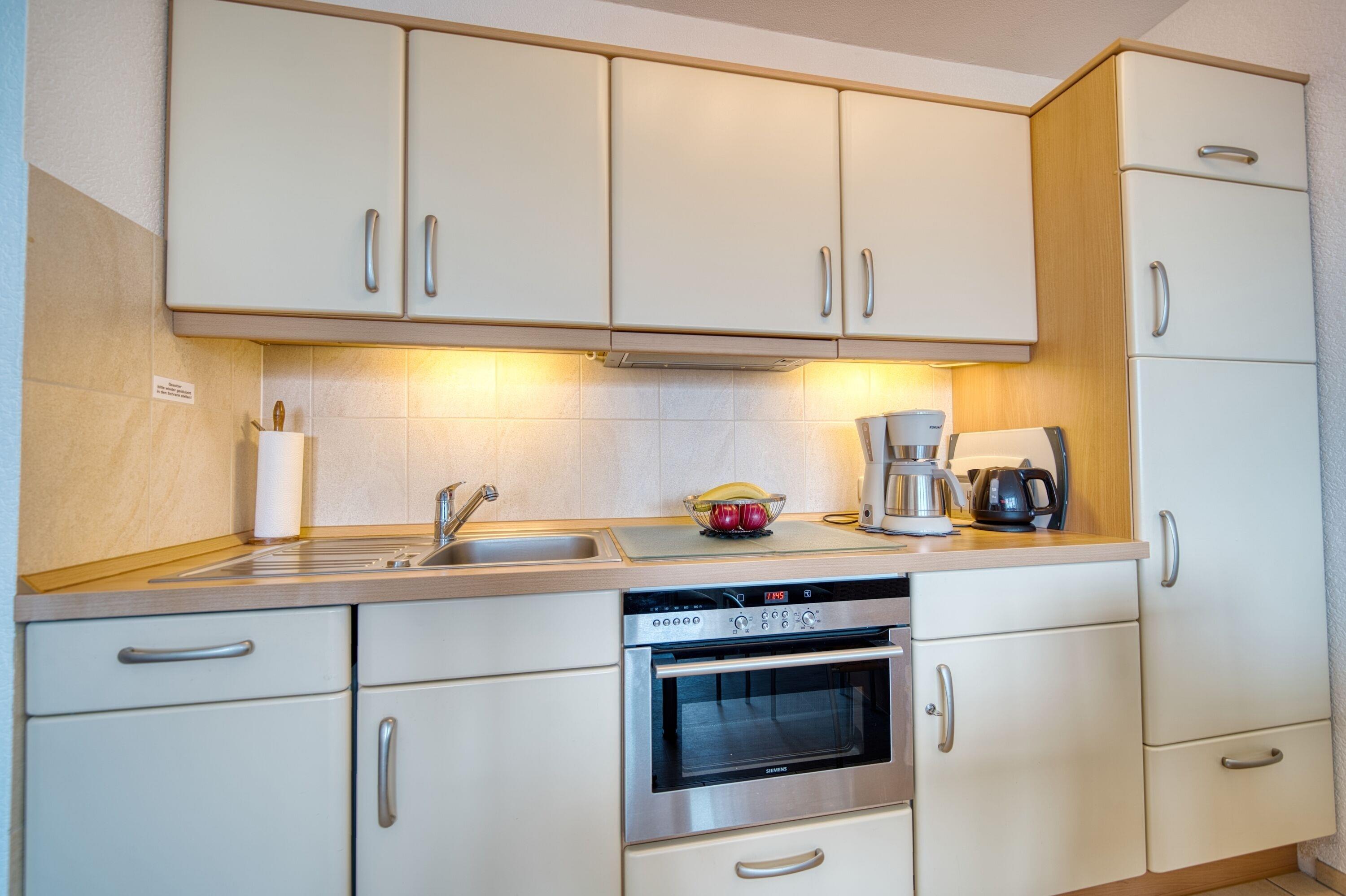 Küche: Voll ausgestattet mit Backofen inklusive Grillfunktion, Cerankochfeld, Kühlschrank mit Gefriermöglichkeit, Geschirrspüler, Toaster, Wasserkocher und Filterkaffeemaschine.