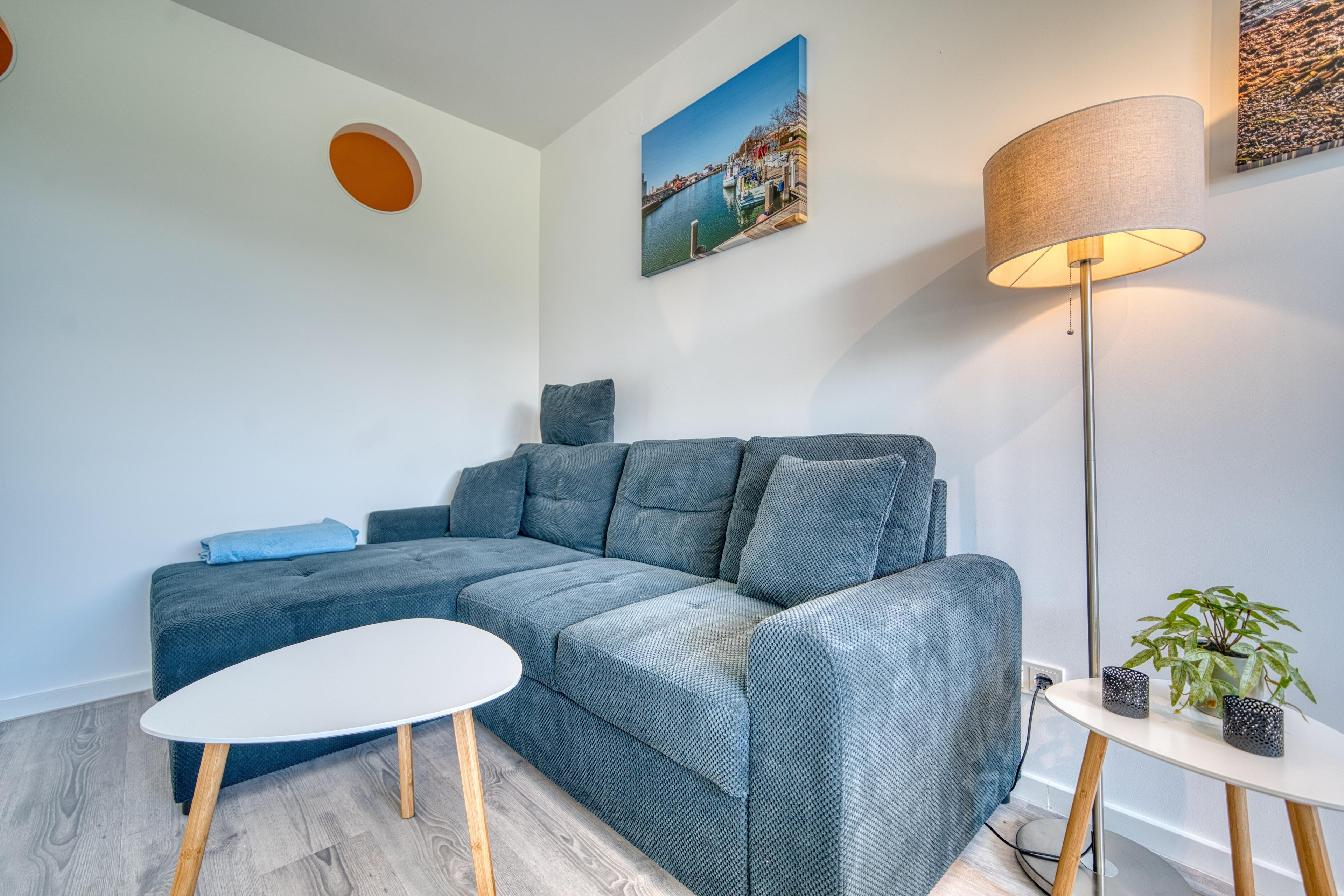 Im offenen Wohnbereich erwarten Sie eine bequeme Couch und ein Flachbildfernseher – perfekt zum Abschalten.