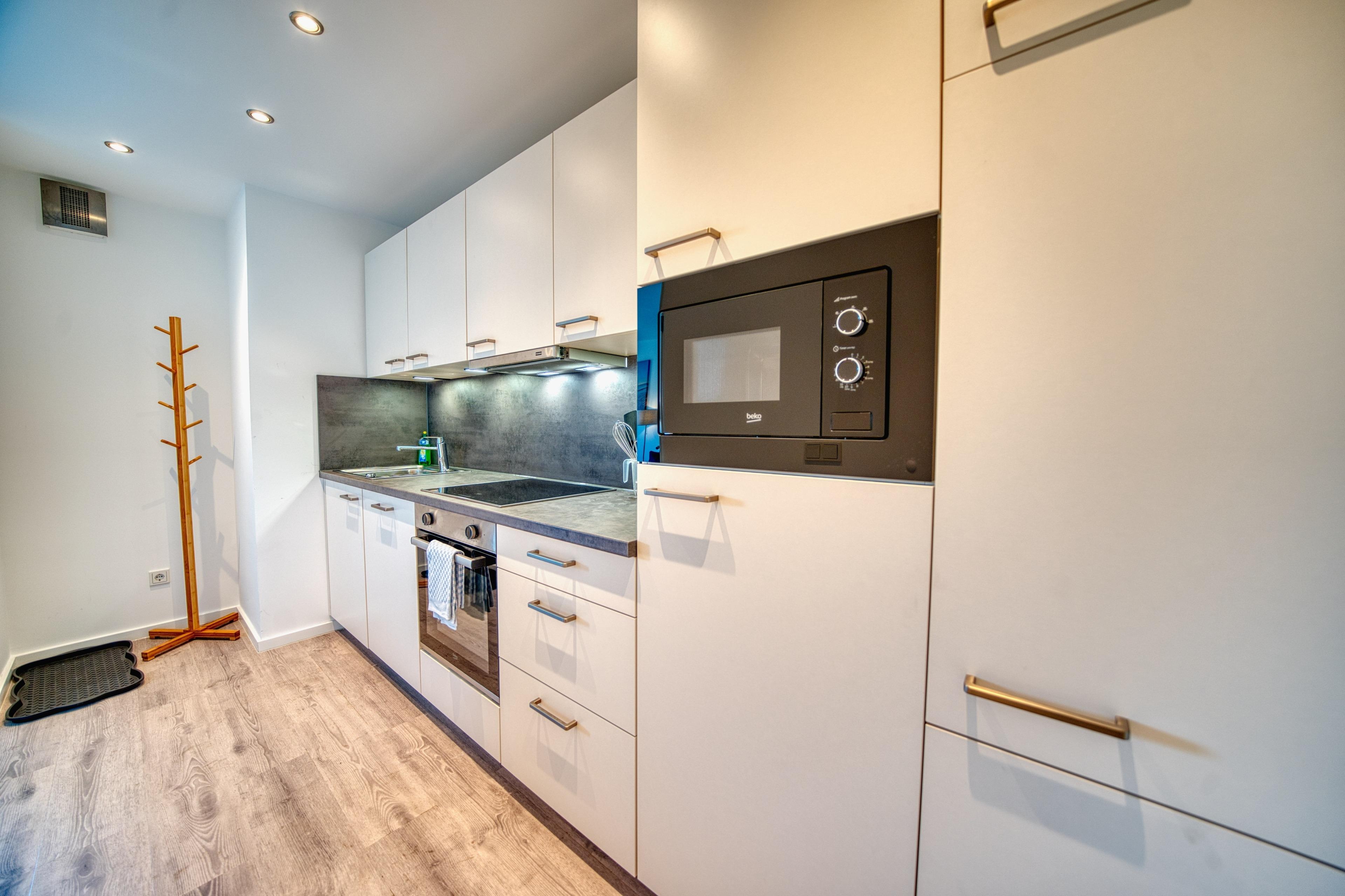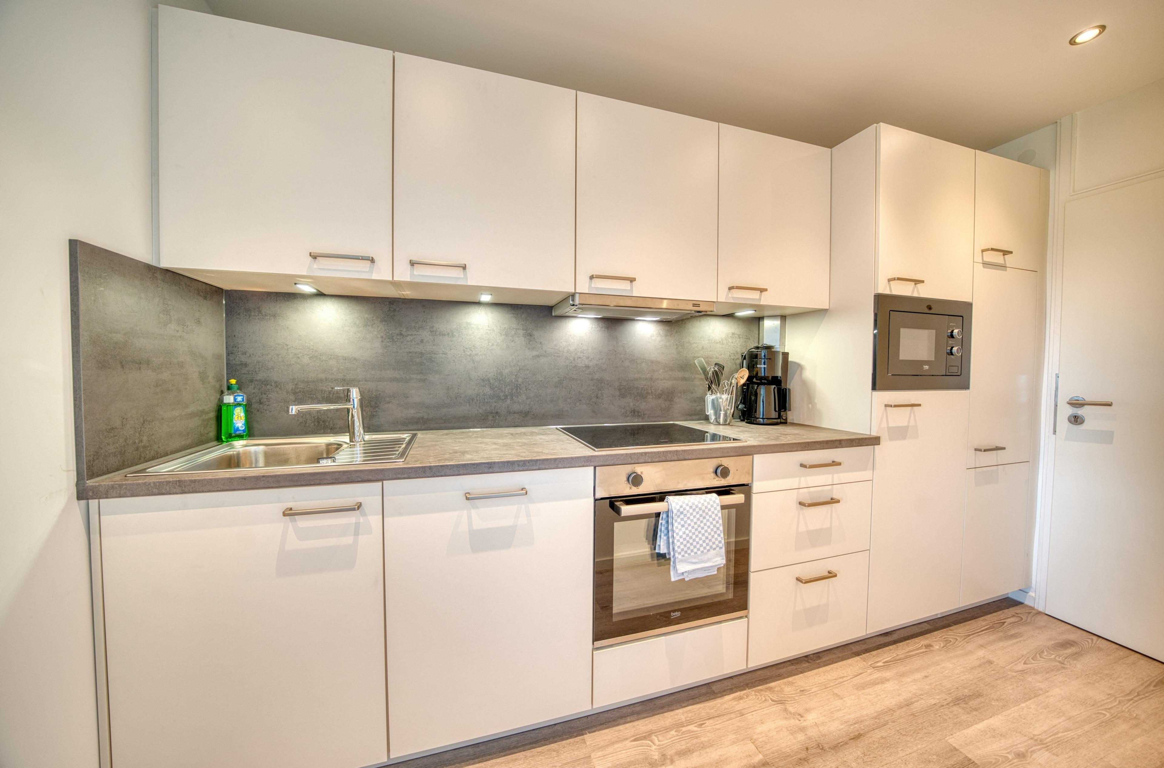 Eine voll ausgestattete Küche im Eingangsbereich – mit Spülmaschine, Backofen, Mikrowelle, Ceranfeld, Kühlschrank mit Gefrierfach und Kaffeemaschine – macht das Kochen zum Vergnügen.