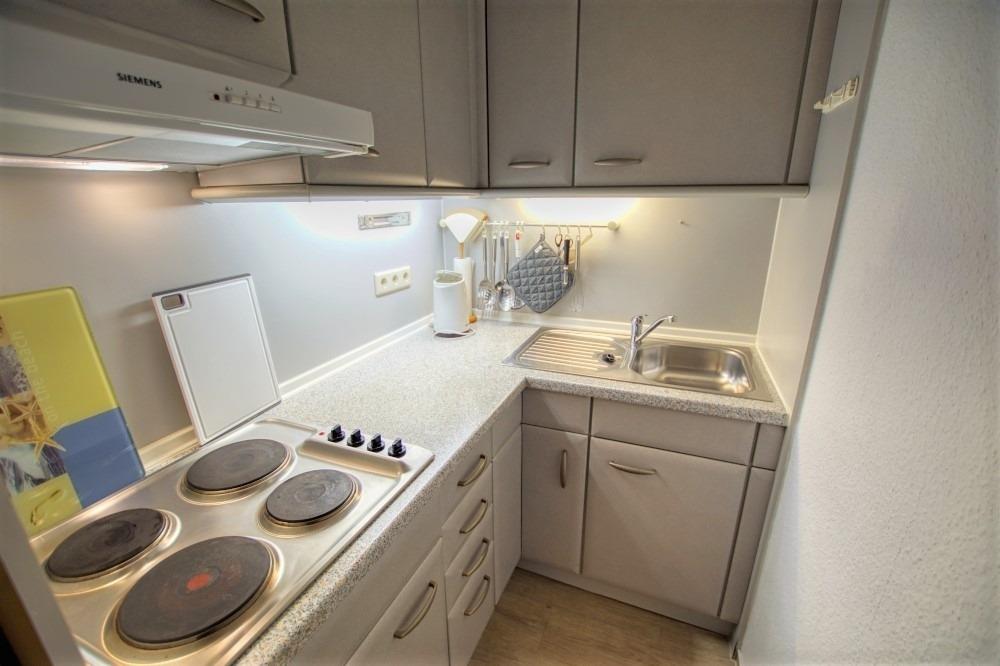 voll ausgestattete Küche mit 4-Plattenherd, Mikrowelle, Kühlschrank mit Gefrierfach sowie allen wichtigen Kochutensilien