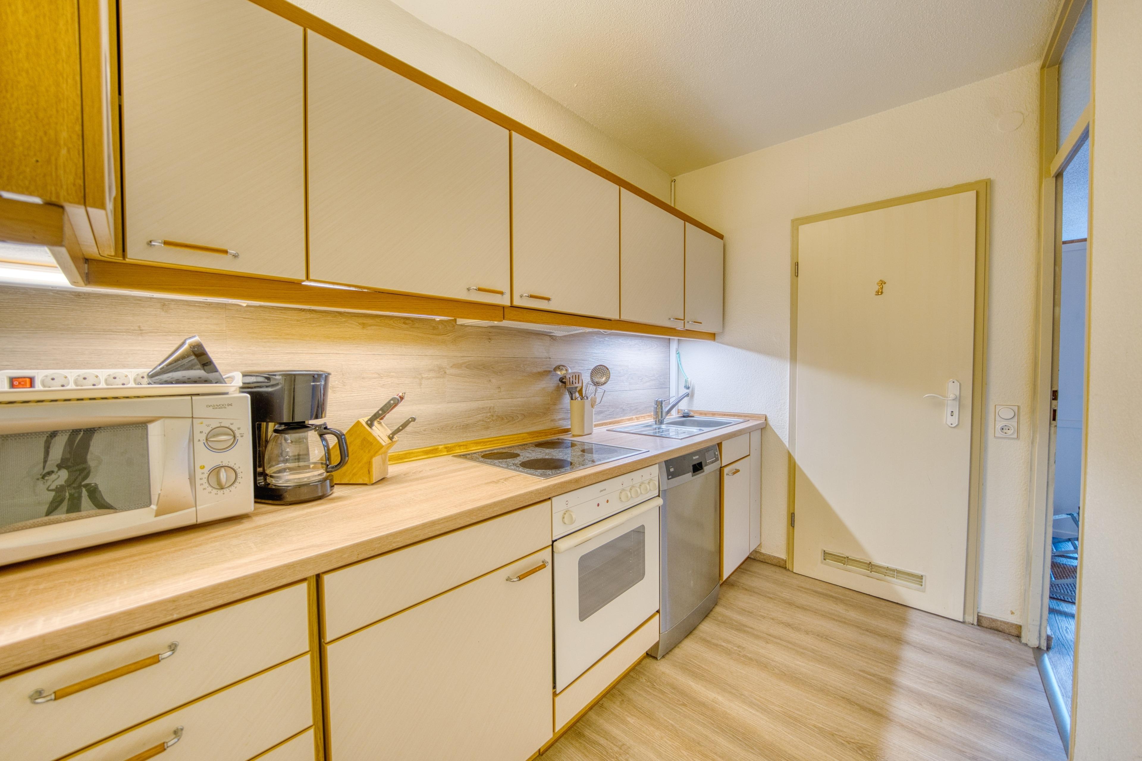komplett ausgestattete Küche mit Geschirrspüler, 4-Plattenherd, Kühlschrank mit Gefrierfach, Mikrowelle, Kaffeemaschine, Wasserkocher, Besteck, Geschirr und Kochutensilien
