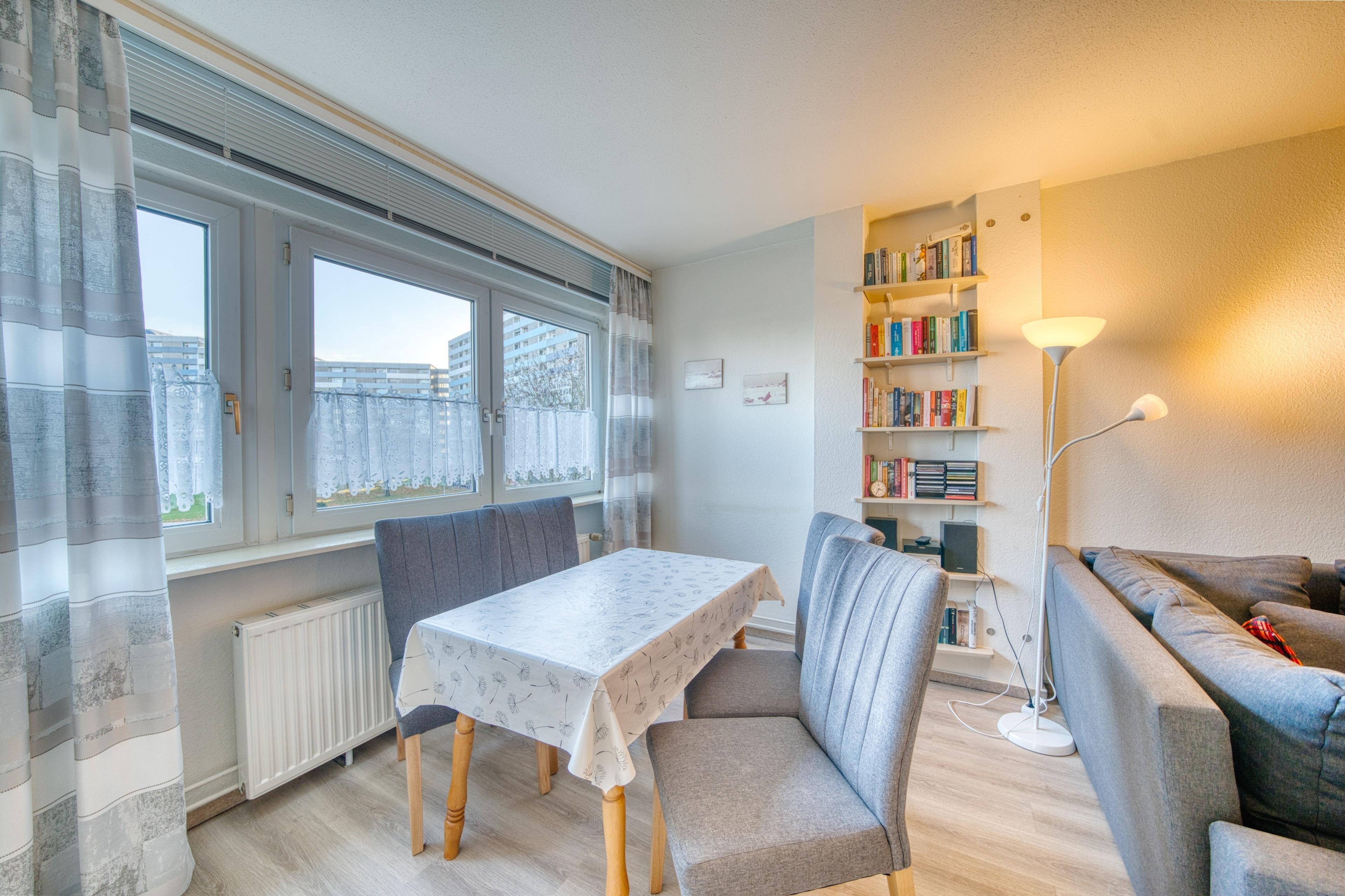 Genießen Sie Ihren Ostseeurlaub in Heiligenhafen in dieser großzügigen 53 m² Ferienwohnung im Haus B des Ferienparks. Die Wohnung liegt in der 2. Etage und bietet einen schönen Blick in den Innenhof. Dank ihrer cleveren Raumaufteilung eignet sie sich ideal für Familien oder bis zu 4 Personen.