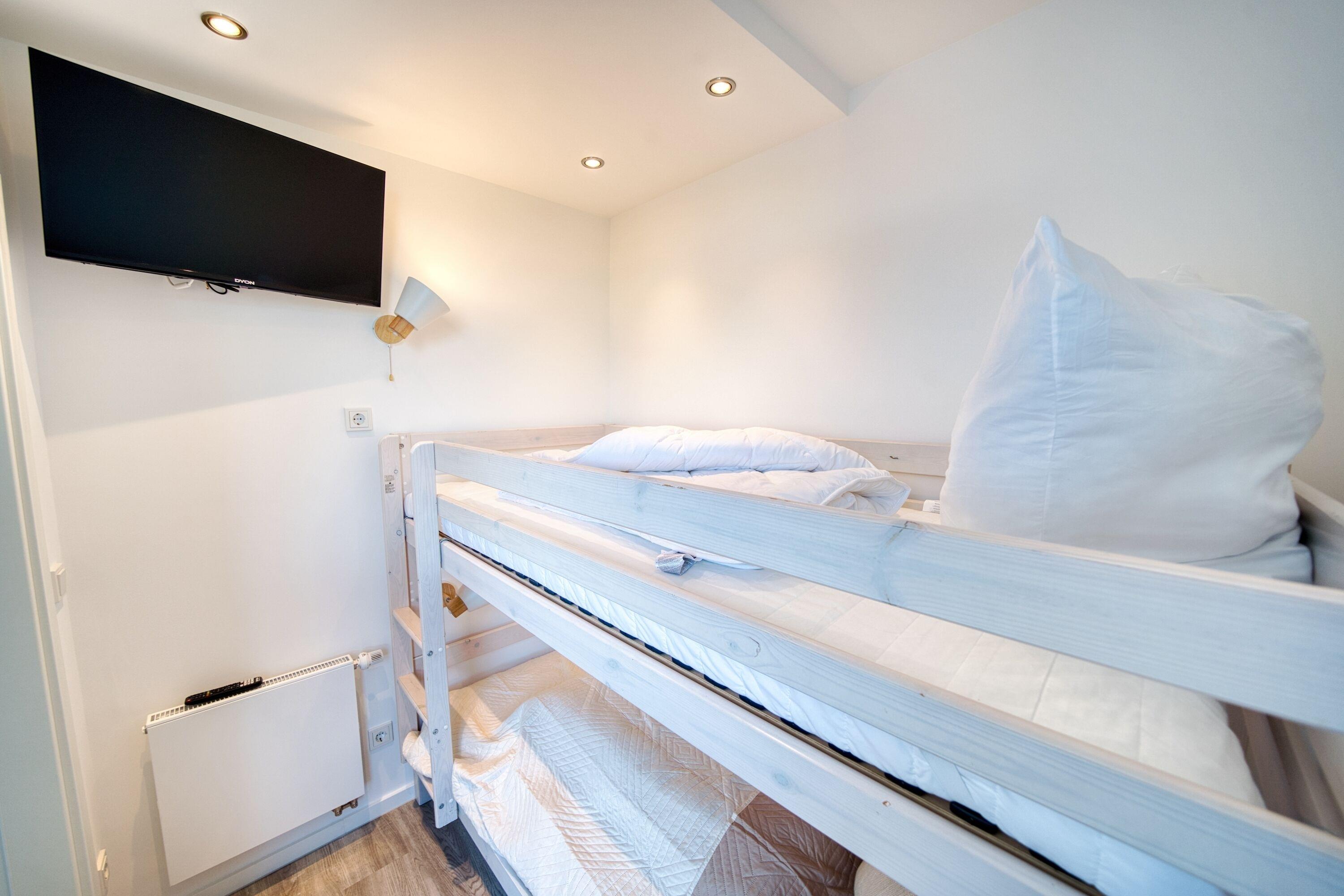 Die stilvolle Wohnung ist ideal für Familien oder Gruppen von bis zu 5 Personen und bietet eine durchdachte Raumaufteilung. Der Wohnbereich mit großzügigem Flachbildfernseher und ausziehbarem Sofa lädt zum Verweilen ein. Im Kinderzimmer mit TV mit Etagenbett können die Kleinen gemütlich schlafen, während die Eltern sich im separaten Schlafbereich mit Doppelbett und eigenem TV entspannen.