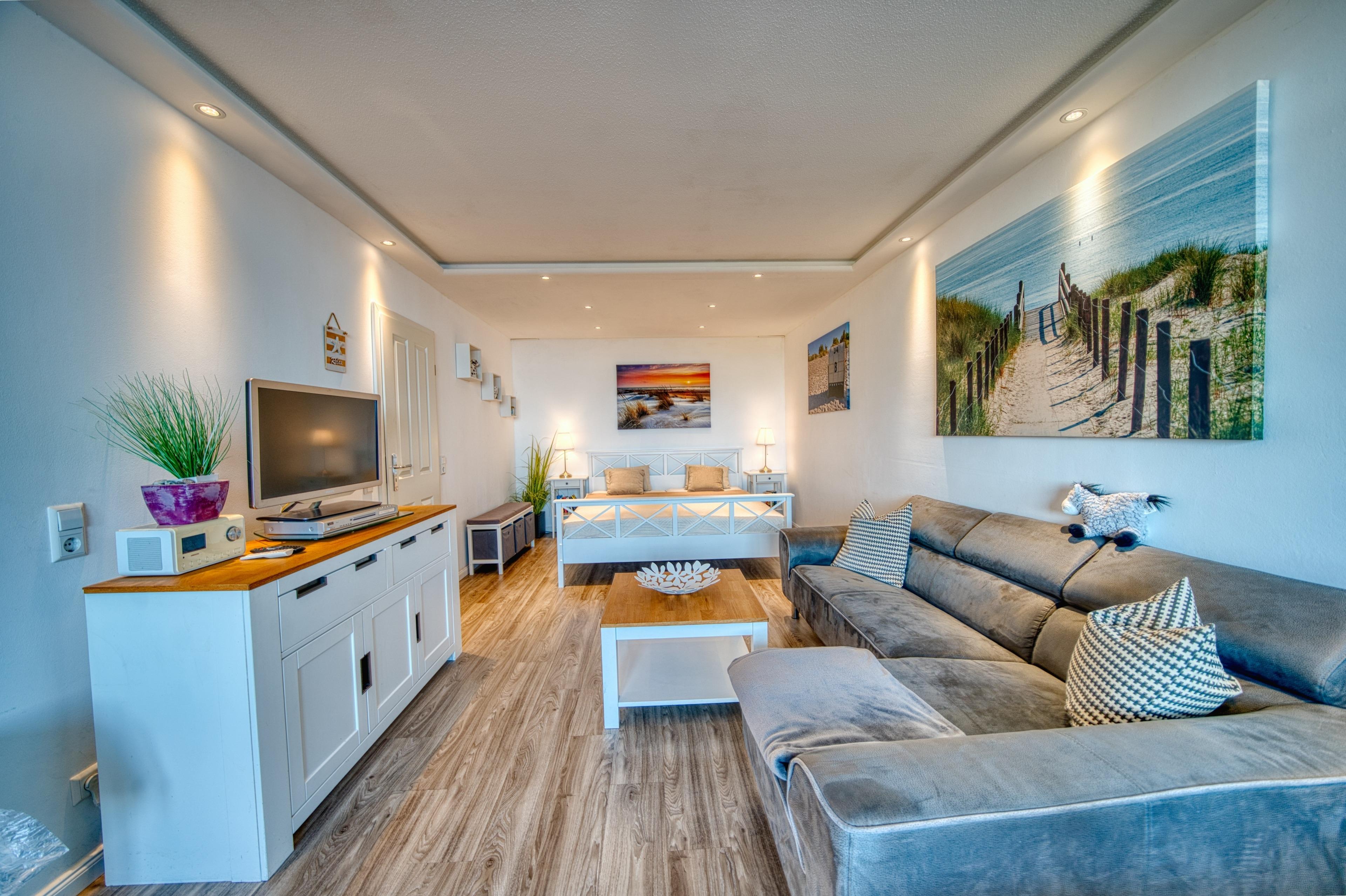 Wohn- und Esszimmer mit gemütlicher Couch, Essecke für 4 Personen, Flachbild-TV, DVD-Player und Radio