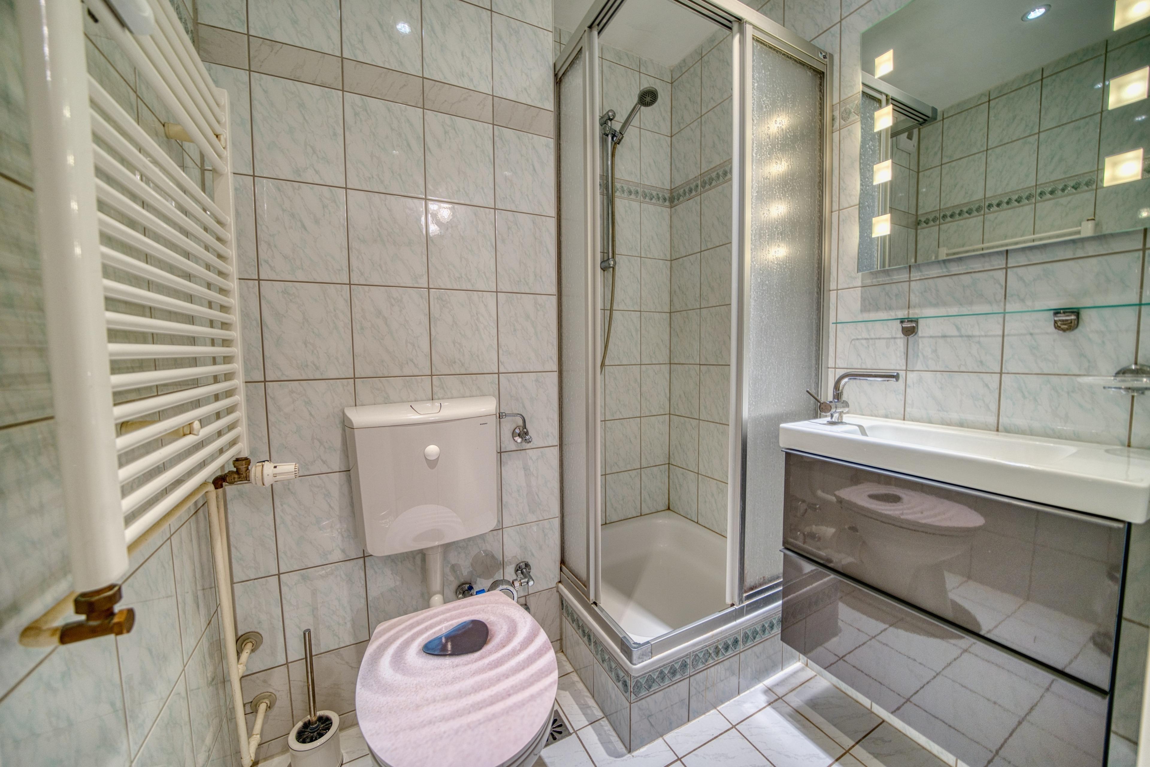modernes Badezimmer mit Dusche, WC und Waschbecken