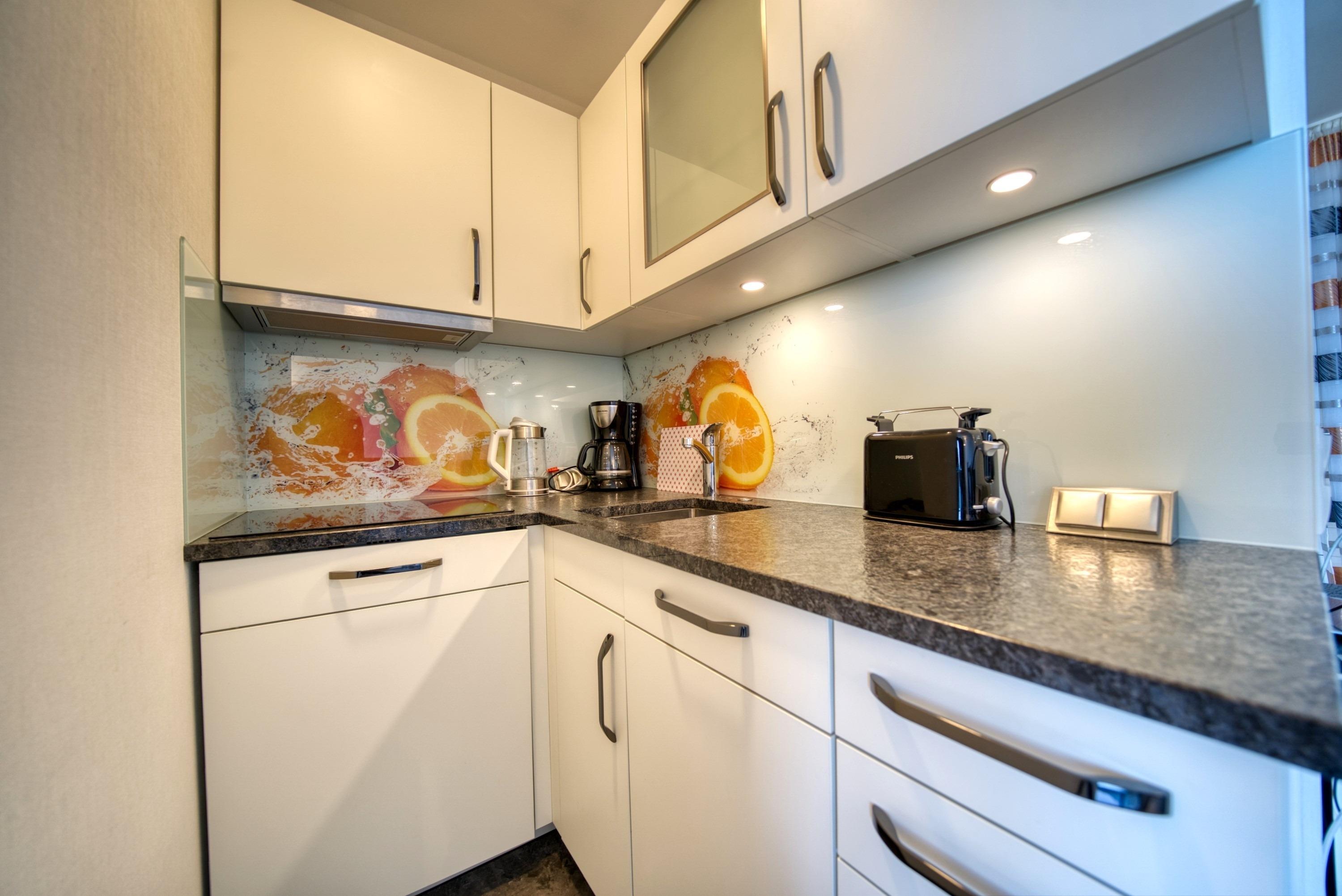 hochwertige Einbauküche mit Induktionsfeld, Backofen, Geschirrspüler, Kühlschrank mit Gefrierfach, Kaffeemaschine [&] umfangreicher Küchenausstattung