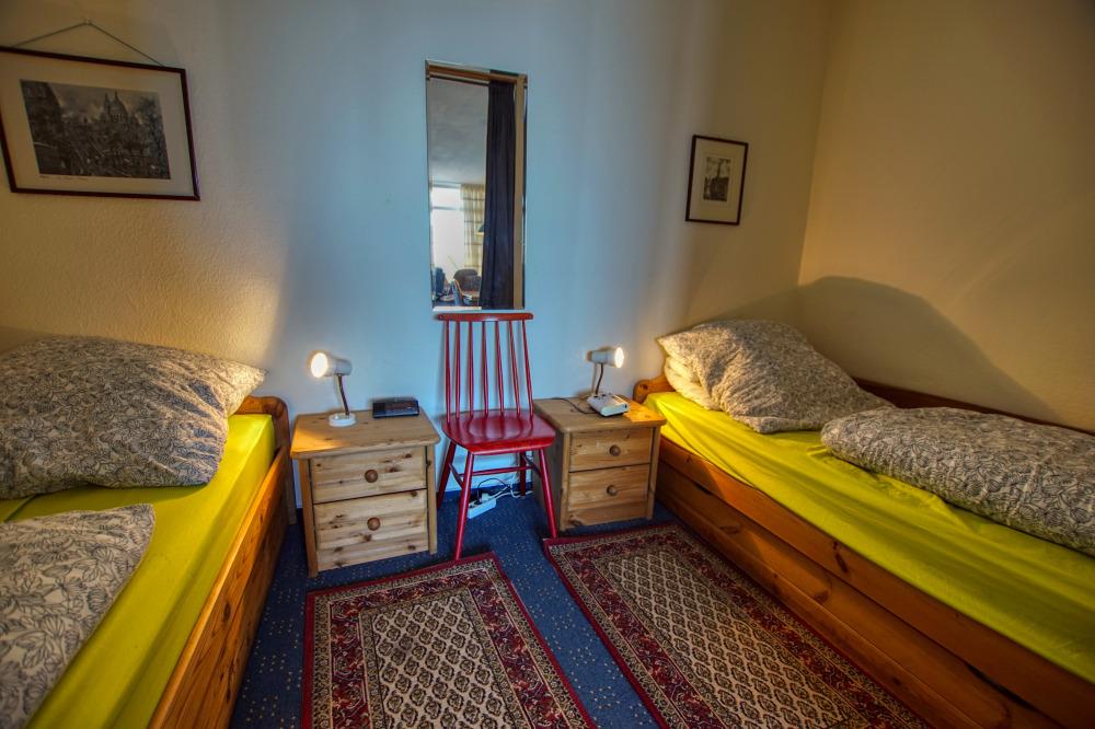 Wohn-Schlafbereich mit zwei Einzelbetten, durch einen Vorhang abtrennbar